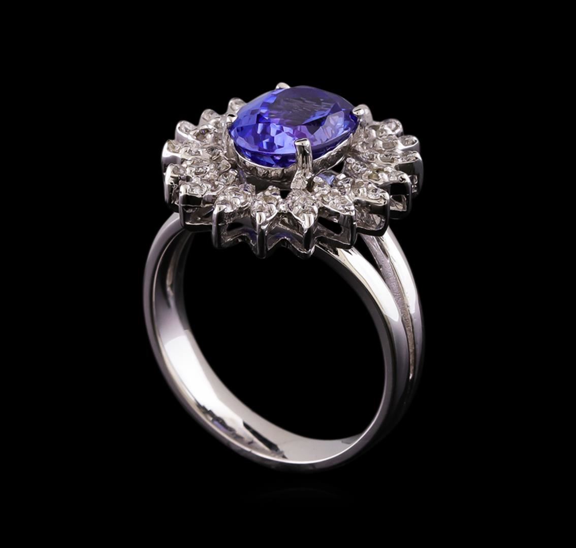 One electronically tested 14KT white gold lady's cast fashion ring with a split shank scalloped halo with a bright polish finish. The featured lady's ring has a shank measuring 3.63 millimeters wide. Identified with markings of "K14". Condition is new, good workmanship. Containing: One prong set oval modified brilliant cut natural tanzanite, measuring 9.46 x 7.47 x 4.98mm, (depth est.) approximate weight of 2.60ct., clarity is eye clean, medium, moderately strong, bluish violet color, (GIA bV 5/4), cut is good. Transmitting light with no distortion, transparent. Colored gemstones are presumed to have been subjected to commonly used enhancement processes. Graded in the setting. Eighteen round brilliant cut diamonds, measuring 1.45 - 1.35 x 0.87mm (depth est.) approximate total weight of 18 Stones = 0.19ct. Graded in the setting. Clarity: SI-1 to SI-2. Color: G - I. Cut Good Thirty-Six prong set round brilliant cut diamonds, measuring 1.30 - 1.20 x 0.76mm (depth est.) approximate total weight of 36 Stones = 0.24ct. Graded in the setting. Clarity: SI-1 to I-1. Color: H - I. Cut Good. Total Weight of Colored Stones 2.60ct. Total Weight of Diamonds 0.43ct. Total Weight of Ring 6.20gm. GAS Appraised at $5,935.00.