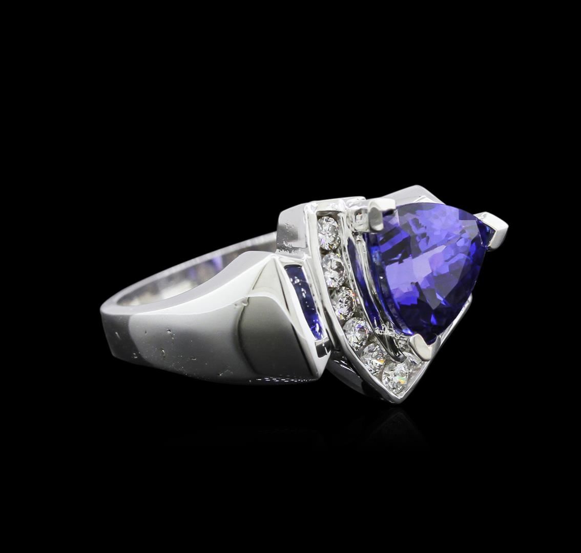 One electronically tested 14KT white gold ladies cast tanzanite and diamond ring with a bright polish finish. The featured tanzanite is supported by a diamond ribbon accent, completed by a two and one-half millimeter wide band. Identified with markings of "14K". Condition is new, good workmanship. Containing: One prong set triangle mixed cut natural tanzanite approximate weight of 2.60ct., clarity is eye clean, type I, medium dark, moderately strong, violetish blue color, (GIA vB 6/4), cut is good. Transmitting light with no distortion, transparent. Graded in the setting. Tanzanite is a very rare gemstone that is only found in the country of Tanzania. Originally discovered in 1967. Tiffany & Company, named the stone Tanzanite. It is found in the Usumburu Mountains that border the Umba Valley of northern Tanzania. Tanzanite occurs in gray, brown, violet, blue, reddish-purple, & green. The gem is interesting because of its exceptional pleochroism. Rotated in different directions a tanzanite will exhibit multiple changes of color. Tanzanite has a low tolerance to ultrasonic cleaning, and should not be cleaned using this method. Nine channel set round brilliant cut diamonds approximate total weight of 9 Stones = 0.27ct. Graded in the setting. Clarity SI-1 to SI-2 Color G - I. Total Weight of Colored Stones 2.60ct. Total Weight of Diamonds 0.27ct. Total Weight of Ring 5.59 grams. AIG Appraised at $7,390.00.