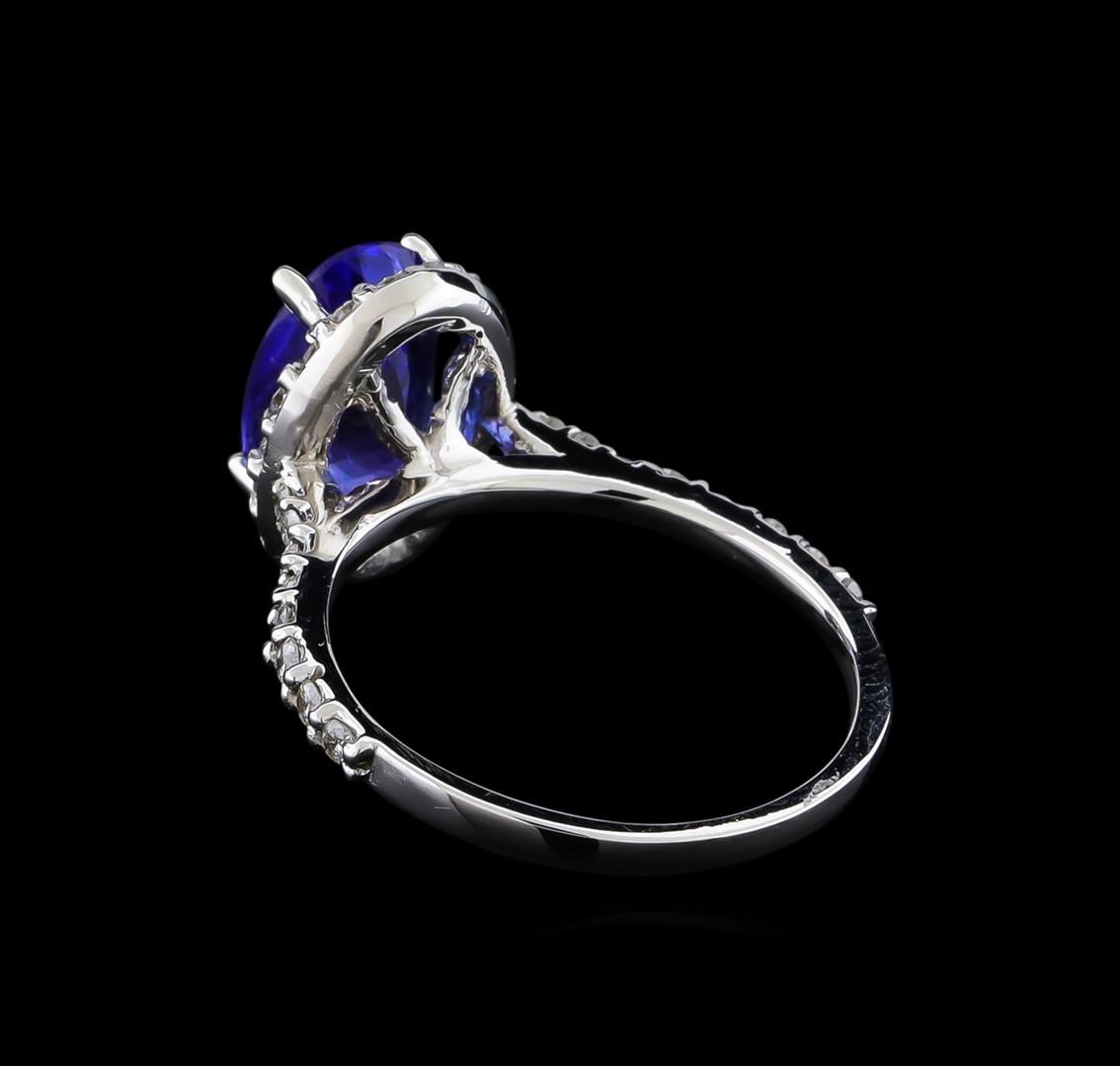 One electronically tested 14KT white gold lady's cast fashion ring with a halo with a bright polish finish. The featured lady's ring has a shank measuring 1.59 millimeters wide. Identified with markings of "K14". Condition is new, good workmanship. Containing: One prong set oval modified brilliant cut natural tanzanite, measuring 10.53 x 7.35 x 4.78mm, approximate weight of 2.60ct., clarity is eye clean, type I, medium dark, strong, violetish blue color, (GIA vB 6/5), cut is very good. Transmitting light with no distortion, transparent. Colored gemstones are presumed to have been subjected to commonly used enhancement processes. Graded in the setting. Ten prong set round brilliant cut diamonds, measuring 1.70 - 1.60 x 1.02mm (depth est.) approximate total weight of 10 Stones = 0.18ct. Graded in the setting. Clarity: SI-1 to SI-2. Color: H - I. Cut Good Twenty-Four prong set round brilliant cut diamonds, measuring 1.40 - 1.35 x 0.86mm (depth est.) approximate total weight of 24 Stones = 0.24ct. Graded in the setting. Clarity: SI-1 to I-1. Color: H - I. Cut Good. Total Weight of Colored Stones 2.60ct. Total Weight of Diamonds 0.42ct. Total Weight of Ring 3.80gm GAS Appraised at $5,775.00.