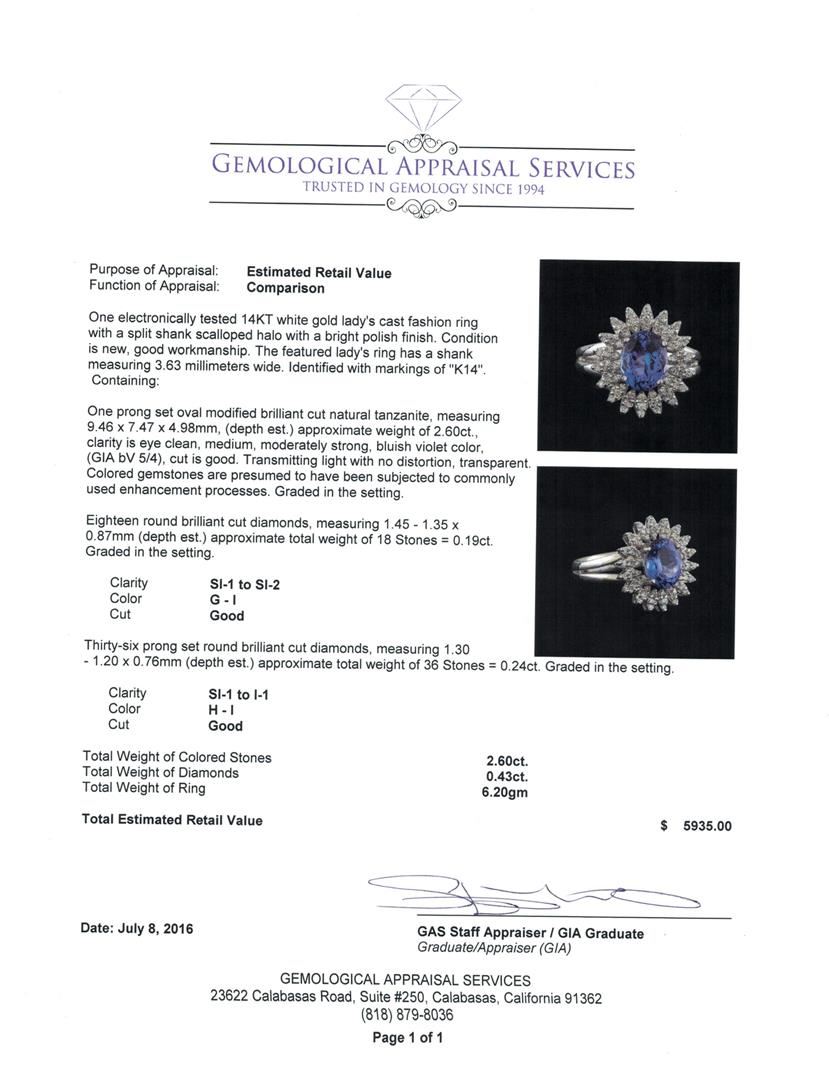 One electronically tested 14KT white gold lady's cast fashion ring with a split shank scalloped halo with a bright polish finish. The featured lady's ring has a shank measuring 3.63 millimeters wide. Identified with markings of "K14". Condition is new, good workmanship. Containing: One prong set oval modified brilliant cut natural tanzanite, measuring 9.46 x 7.47 x 4.98mm, (depth est.) approximate weight of 2.60ct., clarity is eye clean, medium, moderately strong, bluish violet color, (GIA bV 5/4), cut is good. Transmitting light with no distortion, transparent. Colored gemstones are presumed to have been subjected to commonly used enhancement processes. Graded in the setting. Eighteen round brilliant cut diamonds, measuring 1.45 - 1.35 x 0.87mm (depth est.) approximate total weight of 18 Stones = 0.19ct. Graded in the setting. Clarity: SI-1 to SI-2. Color: G - I. Cut Good Thirty-Six prong set round brilliant cut diamonds, measuring 1.30 - 1.20 x 0.76mm (depth est.) approximate total weight of 36 Stones = 0.24ct. Graded in the setting. Clarity: SI-1 to I-1. Color: H - I. Cut Good. Total Weight of Colored Stones 2.60ct. Total Weight of Diamonds 0.43ct. Total Weight of Ring 6.20gm. GAS Appraised at $5,935.00.
