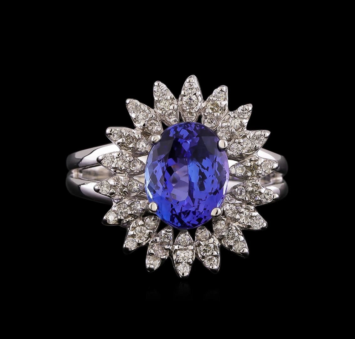 One electronically tested 14KT white gold lady's cast fashion ring with a split shank scalloped halo with a bright polish finish. The featured lady's ring has a shank measuring 3.63 millimeters wide. Identified with markings of "K14". Condition is new, good workmanship. Containing: One prong set oval modified brilliant cut natural tanzanite, measuring 9.46 x 7.47 x 4.98mm, (depth est.) approximate weight of 2.60ct., clarity is eye clean, medium, moderately strong, bluish violet color, (GIA bV 5/4), cut is good. Transmitting light with no distortion, transparent. Colored gemstones are presumed to have been subjected to commonly used enhancement processes. Graded in the setting. Eighteen round brilliant cut diamonds, measuring 1.45 - 1.35 x 0.87mm (depth est.) approximate total weight of 18 Stones = 0.19ct. Graded in the setting. Clarity: SI-1 to SI-2. Color: G - I. Cut Good Thirty-Six prong set round brilliant cut diamonds, measuring 1.30 - 1.20 x 0.76mm (depth est.) approximate total weight of 36 Stones = 0.24ct. Graded in the setting. Clarity: SI-1 to I-1. Color: H - I. Cut Good. Total Weight of Colored Stones 2.60ct. Total Weight of Diamonds 0.43ct. Total Weight of Ring 6.20gm. GAS Appraised at $5,935.00.