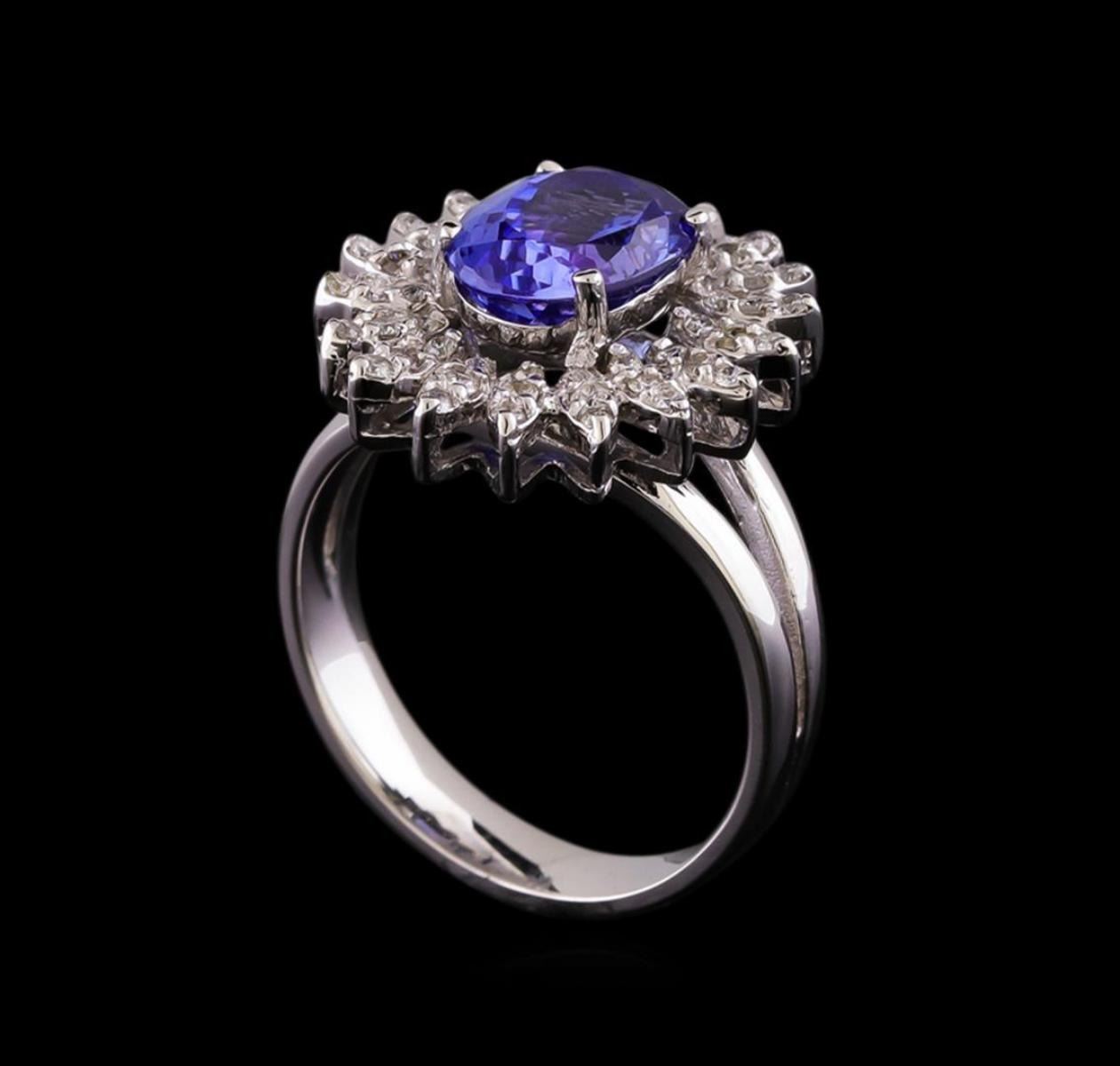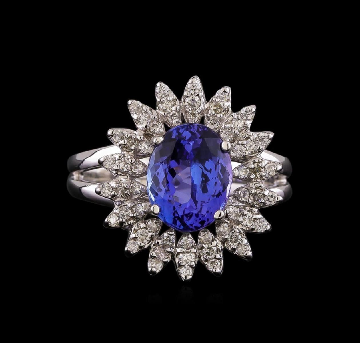 One electronically tested 14KT white gold lady's cast fashion ring with a split shank scalloped halo with a bright polish finish. The featured lady's ring has a shank measuring 3.63 millimeters wide. Identified with markings of "K14". Condition is new, good workmanship. Containing: One prong set oval modified brilliant cut natural tanzanite, measuring 9.46 x 7.47 x 4.98mm, (depth est.) approximate weight of 2.60ct., clarity is eye clean, medium, moderately strong, bluish violet color, (GIA bV 5/4), cut is good. Transmitting light with no distortion, transparent. Colored gemstones are presumed to have been subjected to commonly used enhancement processes. Graded in the setting. Eighteen round brilliant cut diamonds, measuring 1.45 - 1.35 x 0.87mm (depth est.) approximate total weight of 18 Stones = 0.19ct. Graded in the setting. Clarity: SI-1 to SI-2. Color: G - I. Cut Good Thirty-Six prong set round brilliant cut diamonds, measuring 1.30 - 1.20 x 0.76mm (depth est.) approximate total weight of 36 Stones = 0.24ct. Graded in the setting. Clarity: SI-1 to I-1. Color: H - I. Cut Good. Total Weight of Colored Stones 2.60ct. Total Weight of Diamonds 0.43ct. Total Weight of Ring 6.20gm.