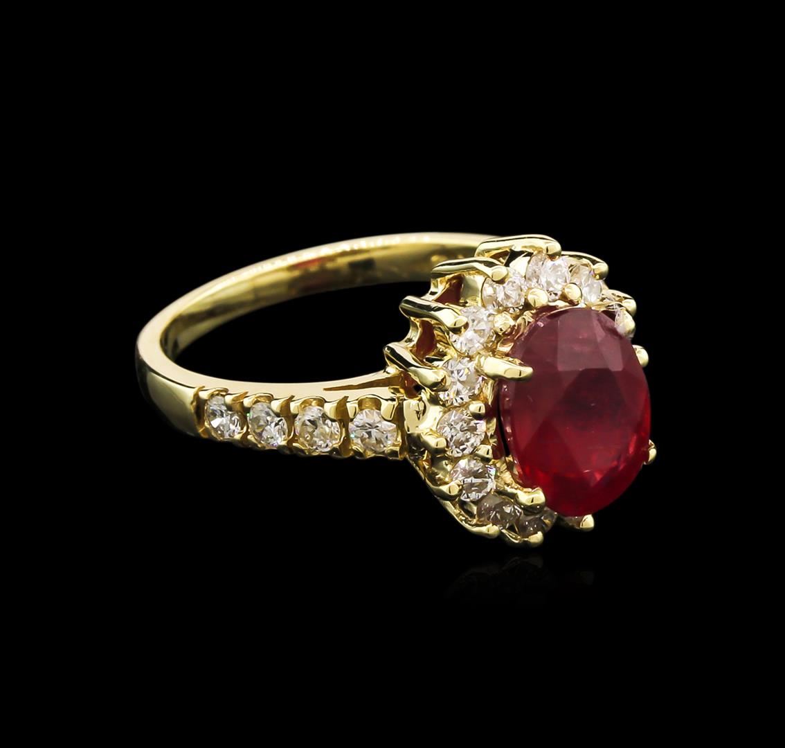 One electronically tested 14KT yellow gold lady's cast fashion ring with a basket halo with a bright polish finish. The featured lady's ring has a shank measuring 1.95 millimeters wide. Identified with markings of "K14". Condition is new, good workmanship. Containing: One prong set oval modified brilliant cut natural ruby, measuring 8.95 x 7.05 x 4.50mm, 5% bulge factor, approximate weight of 2.60ct., clarity is heavily included, type II, medium dark, moderately strong, slightly purplish red color, (GIA slpR 6/4), cut is good. Transmitting light somewhat diffusely, semi-transparent to translucent. Naturally occurring internal & external characteristics are present. Indications of laboratory high temperature heat treatment, with glass & flux additives. Graded in the setting. Twenty-Two prong set round brilliant cut diamonds, measuring 2.10 - 2.00 x 1.33mm (depth est.) approximate total weight of 22 Stones = 0.75ct. Graded in the setting. Clarity: SI-2 to I-1. Color: H - I. Cut Good. Total Weight of Colored Stones 2.60ct. Total Weight of Diamonds 0.75ct. Total Weight of Ring 4.40gm. GAS Appraised at $3,355.00.