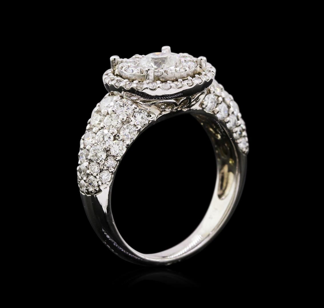 One electronically tested 14KT white gold ladies cast diamond ring with a bright polish finish. The ring features an organized diamond cluster set within a diamond bezel supported by diamond set shoulders, completed by a three millimeter wide band. Identified with markings of "K14". Condition is new, good workmanship. Containing: One prong set round brilliant cut diamond, measuring 4.85 - 4.80 x 2.75mm exact weight 0.49ct. Graded in the setting. Clarity: I-1. Color: I Ninety-Two prong set round brilliant cut diamonds, measuring 2.20 - 1.20 x 1.02mm exact total weight 92 Stones = 2.12ct. Graded in the setting. Clarity: SI-2 to I-1. Color: G - I. Total Weight of Diamonds 2.61ct. Total Weight of Ring 6.47gm. AIG Appraised at $8,580.00.