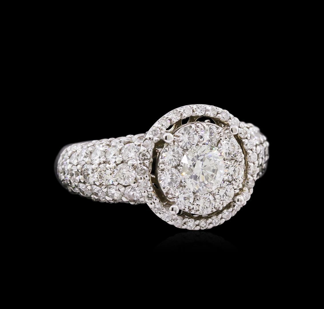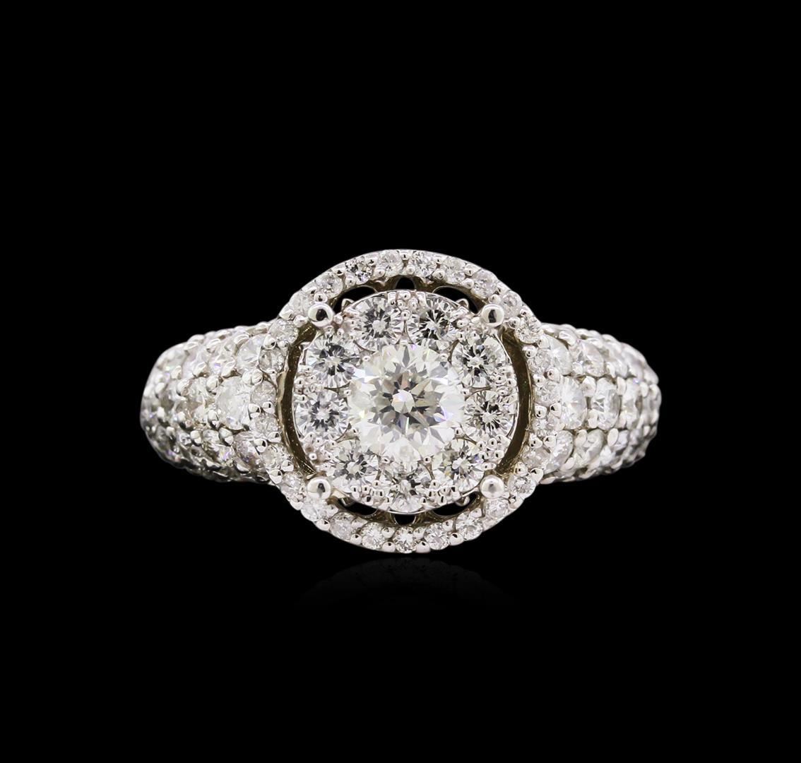 One electronically tested 14KT white gold ladies cast diamond ring with a bright polish finish. The ring features an organized diamond cluster set within a diamond bezel supported by diamond set shoulders, completed by a three millimeter wide band. Identified with markings of "K14". Condition is new, good workmanship. Containing: One prong set round brilliant cut diamond, measuring 4.85 - 4.80 x 2.75mm exact weight 0.49ct. Graded in the setting. Clarity: I-1. Color: I Ninety-Two prong set round brilliant cut diamonds, measuring 2.20 - 1.20 x 1.02mm exact total weight 92 Stones = 2.12ct. Graded in the setting. Clarity: SI-2 to I-1. Color: G - I. Total Weight of Diamonds 2.61ct. Total Weight of Ring 6.47gm. AIG Appraised.