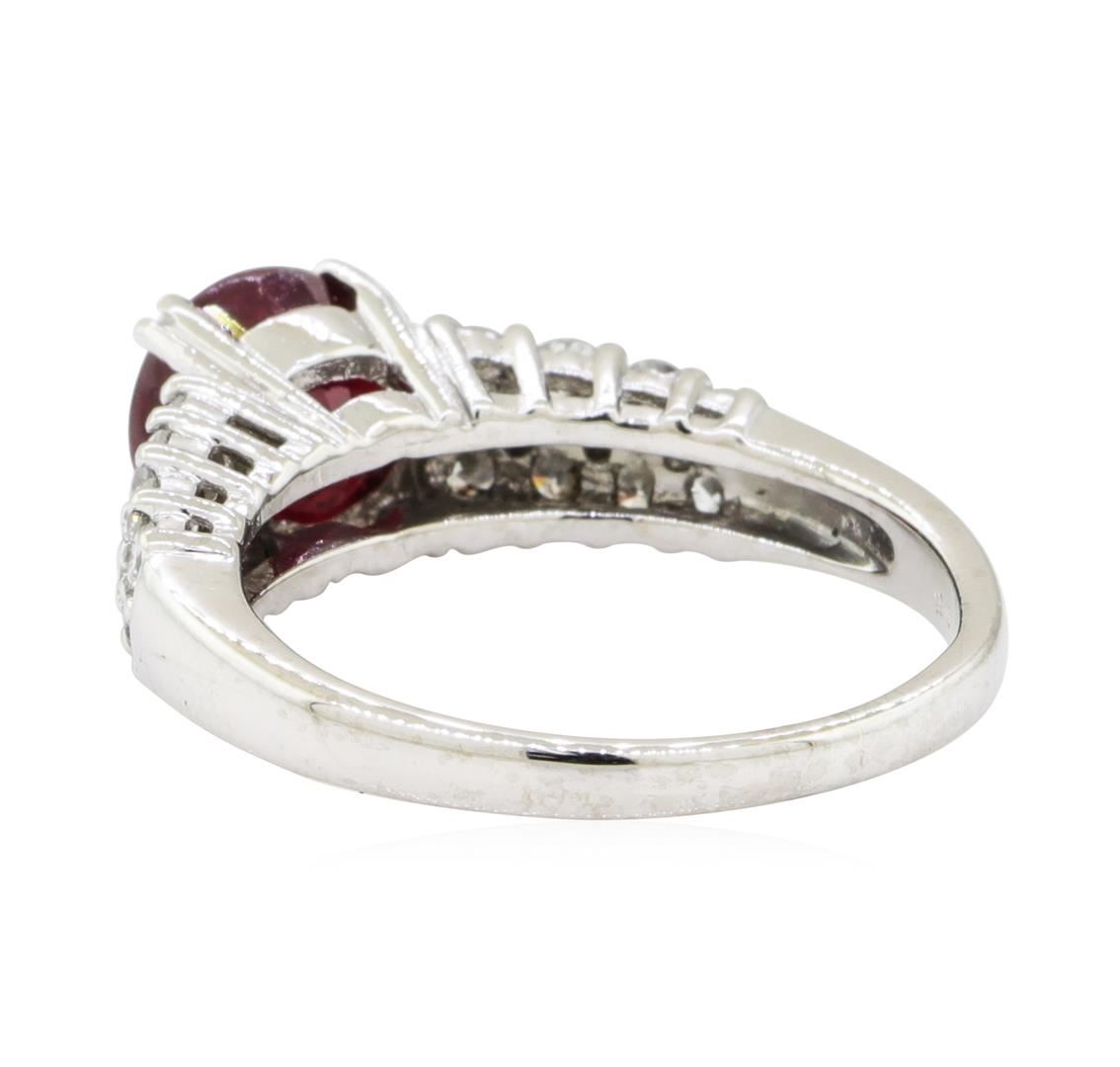 One electronically tested 14KT white gold lady's cast fashion ring with a tapered cathedral shank with a bright polish finish. The featured lady's ring has a double row of diamonds and a shank measuring 1.76 millimeters wide. Identified with markings of '14K'. Condition is new, good workmanship. Containing: One prong set round modified mixed cut natural ruby-glass composite, measuring 6.75 - 6.70 x 4.90 mm, (depth est.) 10%. bulge factor, approximate weight of 2.01ct., clarity is moderately included, medium dark, strong, red color, (GIA R 6/5), cut is very good. Transmitting light somewhat diffusely, transparent to translucent. Naturally occurring internal & external characteristics are present. Indications of laboratory high temperature heat treatment, with glass & flux additives. Colored gemstones are presumed to have been subjected to commonly used enhancement processes. Graded in the setting. Sixteen prong set round brilliant cut diamonds, measuring 2.30 - 1.70 x 1.24mm (depth est.) approximate total weight of 16 Stones = 0.60ct. Graded in the setting. Color G - H Clarity VS-2 to SI-2 Cut Very Good. Total Weight of Colored Stones 2.01ct.. Total Weight of Diamonds 0.60ct.. Total Weight of Ring 5.10gm GAS Appraised at $2835.00. GAS Appraised at $2,835.00.