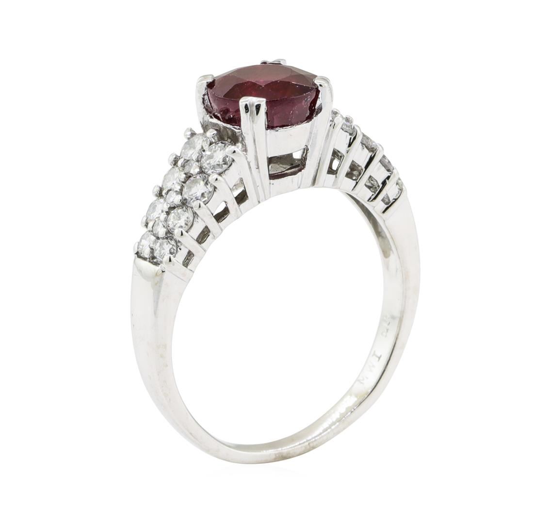 One electronically tested 14KT white gold lady's cast fashion ring with a tapered cathedral shank with a bright polish finish. The featured lady's ring has a double row of diamonds and a shank measuring 1.76 millimeters wide. Identified with markings of '14K'. Condition is new, good workmanship. Containing: One prong set round modified mixed cut natural ruby-glass composite, measuring 6.75 - 6.70 x 4.90 mm, (depth est.) 10%. bulge factor, approximate weight of 2.01ct., clarity is moderately included, medium dark, strong, red color, (GIA R 6/5), cut is very good. Transmitting light somewhat diffusely, transparent to translucent. Naturally occurring internal & external characteristics are present. Indications of laboratory high temperature heat treatment, with glass & flux additives. Colored gemstones are presumed to have been subjected to commonly used enhancement processes. Graded in the setting. Sixteen prong set round brilliant cut diamonds, measuring 2.30 - 1.70 x 1.24mm (depth est.) approximate total weight of 16 Stones = 0.60ct. Graded in the setting. Color G - H Clarity VS-2 to SI-2 Cut Very Good. Total Weight of Colored Stones 2.01ct.. Total Weight of Diamonds 0.60ct.. Total Weight of Ring 5.10gm GAS Appraised at $2835.00. GAS Appraised at $2,835.00.