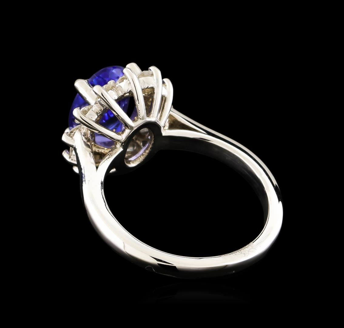 One electronically tested 14KT white gold lady's cast fashion ring with a basket halo with a bright polish finish. The featured lady's ring has a shank measuring 2.22 millimeters wide. Identified with markings of "14K". Condition is new, good workmanship. Containing: One prong set oval modified brilliant cut natural tanzanite, measuring 10.16 x 7.27 x 5.05mm, approximate weight of 2.61ct., clarity is eye clean, medium, moderately strong, bluish violet color, (GIA bV 5/4), cut is good. Transmitting light with no distortion, transparent. Colored gemstones are presumed to have been subjected to commonly used enhancement processes. Graded in the setting. Twelve prong set round brilliant cut diamonds, measuring 2.40 - 2.30 x 1.46mm (depth est.) approximate total weight of 12 Stones = 0.60ct. Graded in the setting. Clarity: SI-1 to SI-2. Color: H - I. Cut Good. Total Weight of Colored Stones 2.61ct. Total Weight of Diamonds 0.60ct. Total Weight of Ring 5.40gm. GAS Appraised at $5,750.00.