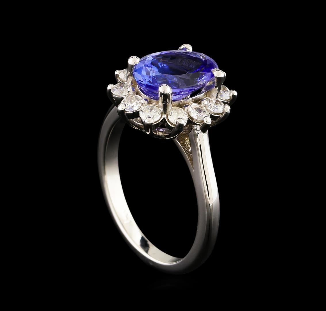 One electronically tested 14KT white gold lady's cast fashion ring with a basket halo with a bright polish finish. The featured lady's ring has a shank measuring 2.22 millimeters wide. Identified with markings of "14K". Condition is new, good workmanship. Containing: One prong set oval modified brilliant cut natural tanzanite, measuring 10.16 x 7.27 x 5.05mm, approximate weight of 2.61ct., clarity is eye clean, medium, moderately strong, bluish violet color, (GIA bV 5/4), cut is good. Transmitting light with no distortion, transparent. Colored gemstones are presumed to have been subjected to commonly used enhancement processes. Graded in the setting. Twelve prong set round brilliant cut diamonds, measuring 2.40 - 2.30 x 1.46mm (depth est.) approximate total weight of 12 Stones = 0.60ct. Graded in the setting. Clarity: SI-1 to SI-2. Color: H - I. Cut Good. Total Weight of Colored Stones 2.61ct. Total Weight of Diamonds 0.60ct. Total Weight of Ring 5.40gm.