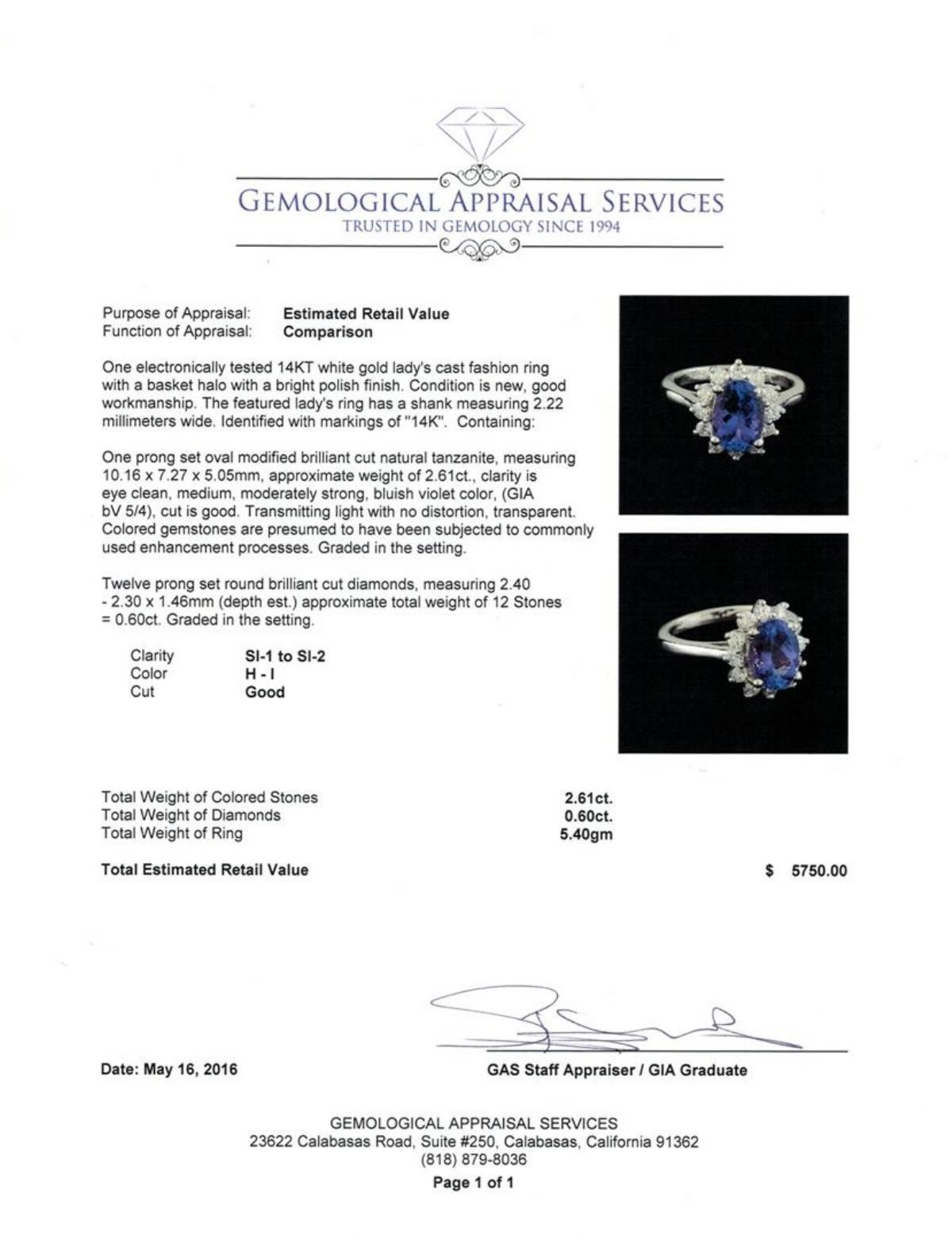 One electronically tested 14KT white gold lady's cast fashion ring with a basket halo with a bright polish finish. The featured lady's ring has a shank measuring 2.22 millimeters wide. Identified with markings of "14K". Condition is new, good workmanship. Containing: One prong set oval modified brilliant cut natural tanzanite, measuring 10.16 x 7.27 x 5.05mm, approximate weight of 2.61ct., clarity is eye clean, medium, moderately strong, bluish violet color, (GIA bV 5/4), cut is good. Transmitting light with no distortion, transparent. Colored gemstones are presumed to have been subjected to commonly used enhancement processes. Graded in the setting. Twelve prong set round brilliant cut diamonds, measuring 2.40 - 2.30 x 1.46mm (depth est.) approximate total weight of 12 Stones = 0.60ct. Graded in the setting. Clarity: SI-1 to SI-2. Color: H - I. Cut Good. Total Weight of Colored Stones 2.61ct. Total Weight of Diamonds 0.60ct. Total Weight of Ring 5.40gm.