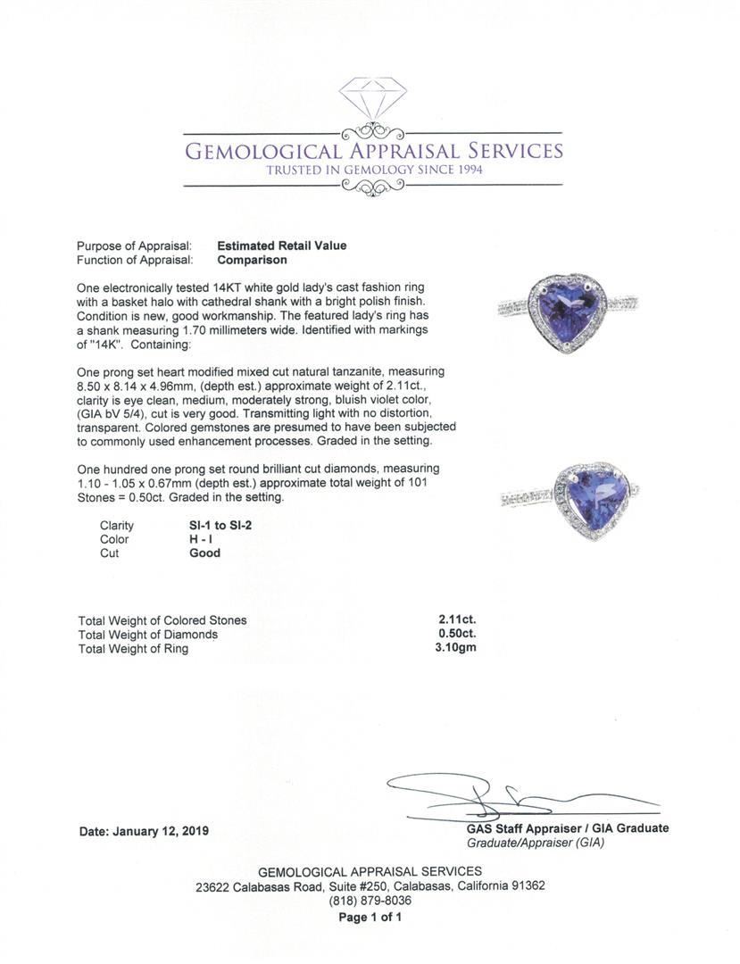 One electronically tested 14KT white gold lady's cast fashion ring with a basket halo with cathedral shank with a bright polish finish. The featured lady's ring has a shank measuring 1.70 millimeters wide. Identified with markings of '14K'. Condition is new, good workmanship. Containing: One prong set heart modified mixed cut natural tanzanite, measuring 8.50 x 8.14 x 4.96mm, (depth est.) approximate weight of 2.11ct., clarity is eye clean, medium, moderately strong, bluish violet color, (GIA bV 5/4), cut is very good. Transmitting light with no distortion, transparent. Colored gemstones are presumed to have been subjected to commonly used enhancement processes. Graded in the setting. One Hundred One prong set round brilliant cut diamonds, measuring 1.10 - 1.05 x 0.67mm (depth est.) approximate total weight of 101 Stones = 0.50 ct. Graded in the setting. Color H - I Clarity SI-1 to SI-2 Cut Good. Total Weight of Colored Stones 2.11ct.. Total Weight of Diamonds 0.50 ct.. Total Weight of Ring 3.10gm GAS Appraised at $4550.00. GAS Appraised.