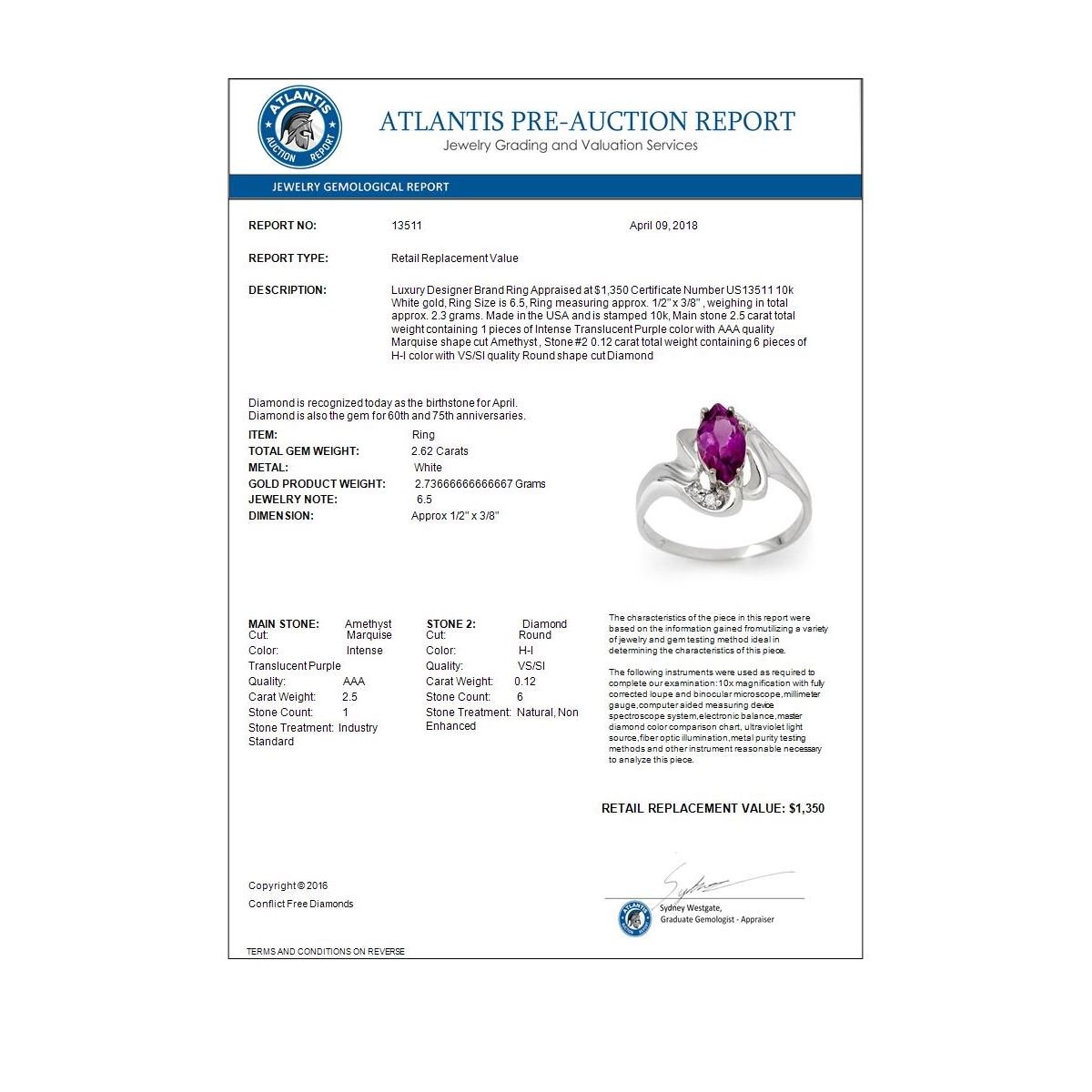 REF-20X8T -13511 ---- 2.62 CTW Amethyst & Diamond Ring 10K White Gold ---- Luxury Designer Brand Ring Appraised at $1,350 Certificate Number US13511 10k White gold, Ring Size is 6.5, Ring measuring approx. 1/2" x 3/8" , weighing in total approx. 2.3 grams. Made in the USA and is stamped 10k, Main stone 2.5 carat total weight containing 1 pieces of Intense Translucent Purple color with AAA quality Marquise shape cut Amethyst , Stone #2 0.12 carat total weight containing 6 pieces of H-I color with VS/SI quality Round shape cut Diamond