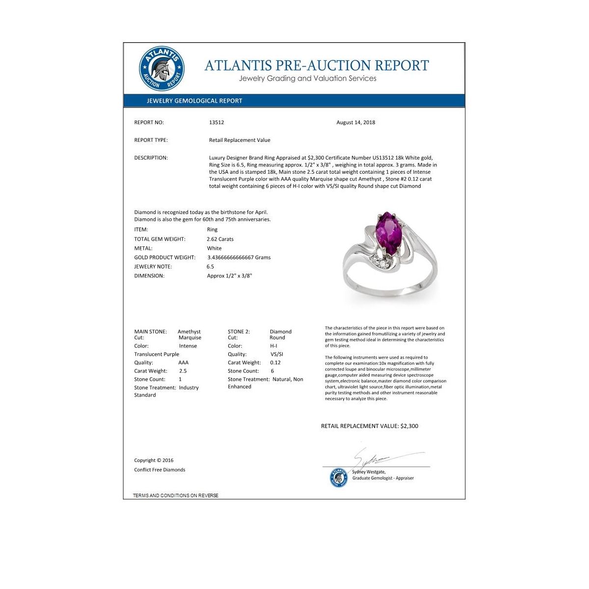 REF-34M5H -13512 ---- 2.62 CTW Amethyst & Diamond Ring 18K White Gold ---- Luxury Designer Brand Ring Appraised at $2,300 Certificate Number US13512 18k White gold, Ring Size is 6.5, Ring measuring approx. 1/2" x 3/8" , weighing in total approx. 3 grams. Made in the USA and is stamped 18k, Main stone 2.5 carat total weight containing 1 pieces of Intense Translucent Purple color with AAA quality Marquise shape cut Amethyst , Stone #2 0.12 carat total weight containing 6 pieces of H-I color with VS/SI quality Round shape cut Diamond