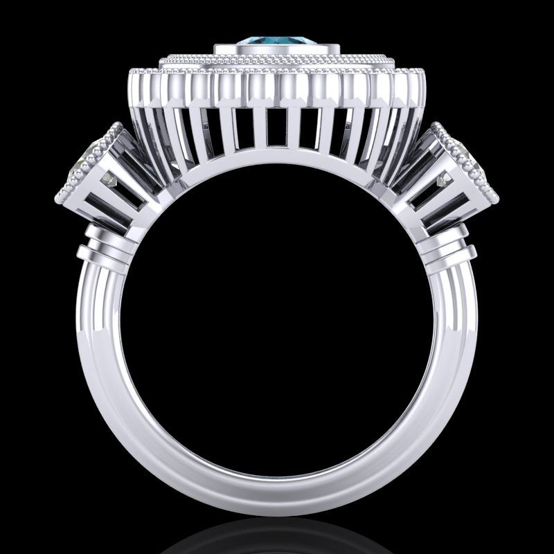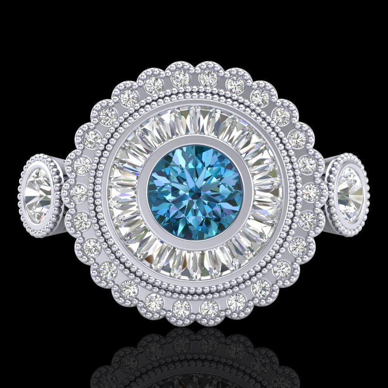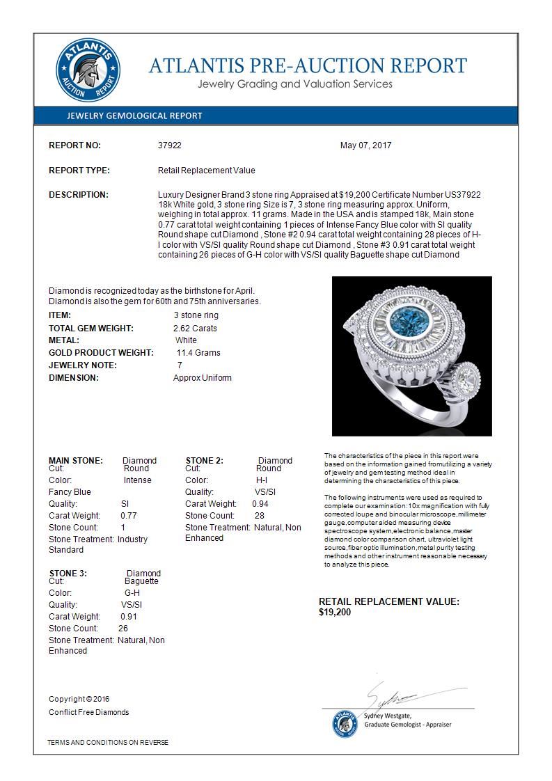 2.62 CTW Intense Blue Diamond Solitaire Art Deco 3 Stone Ring 18K White Gold ---- Luxury Designer Brand 3 stone ring Appraised Retail Price at $19,200 ---- SKU Number US37922 18k White gold 3 stone ring Size is 7, 3 stone ring measuring approx. Uniform, weighing in total approx. 11 grams. Made in the USA and is stamped 18k, Main stone 0.77 carat total weight containing 1 pieces of Intense Fancy Blue color with SI quality Round shape cut Diamond , Stone #2 0.94 carat total weight containing 28 pieces of H-I color with VS/SI quality Round shape cut