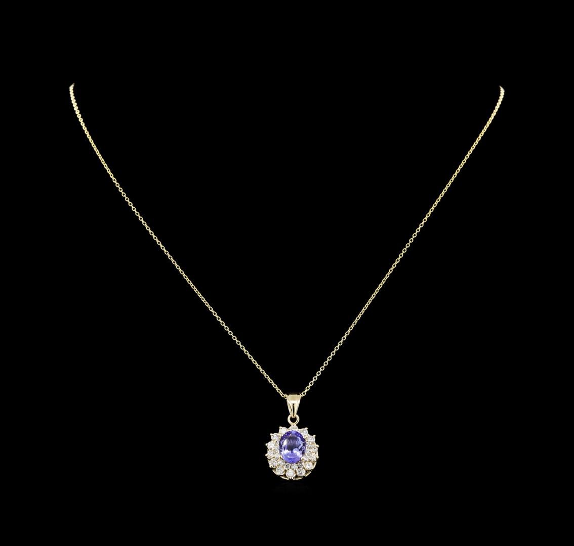 One electronically tested 14KT yellow gold lady's combination cast & assembled fashion pendant & chain 18.0' long, 1.3 oval cable link with a lobster claw clasp with a bright polish finish. The featured lady's pendant and chain has a drop measuring 26 millimeters in length. Identified with markings of '14K'. Condition is new, good workmanship. Containing: Fourteen prong set round brilliant cut diamonds, measuring 2.40 - 2.30 x 1.46mm (depth est.) approximate total weight of 14 Stones = 0.70ct. Graded in the setting. Clarity SI-1 to SI-2. Color: H - I Cut Good Fourteen prong set round brilliant cut diamonds, measuring 1.90 - 1.80 x 1.15mm (depth est.) approximate total weight of 14 Stones = 0.34ct. Graded in the setting. Clarity SI-1 to SI-2. Color: H - I Cut Good One prong set oval modified brilliant cut natural tanzanite, measuring 9.58 x 7.78 x 4.88mm, (depth est.) approximate weight of 2.62ct., clarity is eye clean, medium light, very slightly grayish, bluish violet color, (GIA bV 4/3), cut is very good. Transmitting light with no distortion, transparent. Colored gemstones are presumed to have been subjected to commonly used enhancement processes. Graded in the setting. Total Weight of Colored Stones 2.62ct.. Total Weight of Diamonds 1.04ct.. Total Weight of Pendant & Chain 5.60gm. GAS Appraised at $5,645.00.