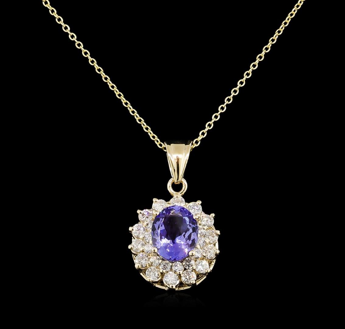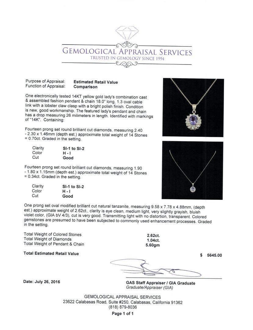 One electronically tested 14KT yellow gold lady's combination cast & assembled fashion pendant & chain 18.0' long, 1.3 oval cable link with a lobster claw clasp with a bright polish finish. The featured lady's pendant and chain has a drop measuring 26 millimeters in length. Identified with markings of '14K'. Condition is new, good workmanship. Containing: Fourteen prong set round brilliant cut diamonds, measuring 2.40 - 2.30 x 1.46mm (depth est.) approximate total weight of 14 Stones = 0.70ct. Graded in the setting. Clarity SI-1 to SI-2. Color: H - I Cut Good Fourteen prong set round brilliant cut diamonds, measuring 1.90 - 1.80 x 1.15mm (depth est.) approximate total weight of 14 Stones = 0.34ct. Graded in the setting. Clarity SI-1 to SI-2. Color: H - I Cut Good One prong set oval modified brilliant cut natural tanzanite, measuring 9.58 x 7.78 x 4.88mm, (depth est.) approximate weight of 2.62ct., clarity is eye clean, medium light, very slightly grayish, bluish violet color, (GIA bV 4/3), cut is very good. Transmitting light with no distortion, transparent. Colored gemstones are presumed to have been subjected to commonly used enhancement processes. Graded in the setting. Total Weight of Colored Stones 2.62ct.. Total Weight of Diamonds 1.04ct.. Total Weight of Pendant & Chain 5.60gm. GAS Appraised at $5,645.00.