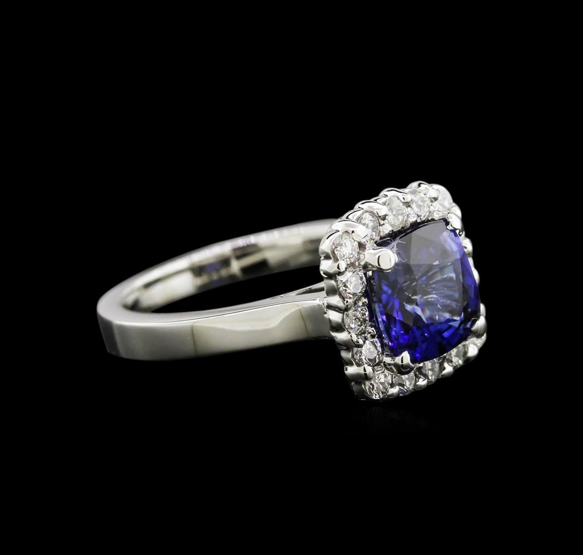 One electronically tested 14KT white gold lady's cast fashion ring with a cathedral shank with a bright polish finish. The featured lady's ring has a shank measuring 2.51 millimeters in width. Identified with markings of "14K". Condition is new, good workmanship. Containing: One prong set square cushion modified brilliant cut natural tanzanite, measuring 7.95 x 7.70 x 5.09mm, 5% bulge factor, approximate weight of 2.62ct., clarity is eye clean, type I, dark, moderately strong, blue color, (GIA B 7/4), cut is good. Transmitting light with no distortion, transparent. Colored gemstones are presumed to have been subjected to commonly used enhancement processes. Graded in the setting. Sixteen prong set round brilliant cut diamonds, measuring 2.00 - 1.95 x 1.29mm (depth est.) approximate total weight of 16 Stones = 0.49ct. Graded in the setting. Clarity: SI-2 to I-1. Color: H - I. Cut Good. Total Weight of Colored Stones 2.62ct. Total Weight of Diamonds 0.49ct. Total Weight of Ring 5.90gm. GAS Appraised at $5,155.00.