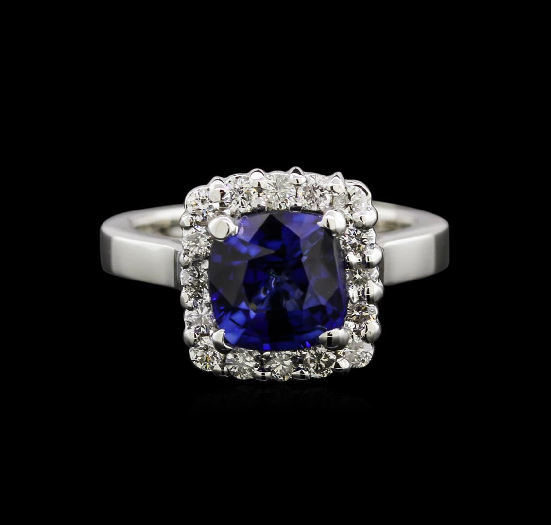One electronically tested 14KT white gold lady's cast fashion ring with a cathedral shank with a bright polish finish. The featured lady's ring has a shank measuring 2.51 millimeters in width. Identified with markings of "14K". Condition is new, good workmanship. Containing: One prong set square cushion modified brilliant cut natural tanzanite, measuring 7.95 x 7.70 x 5.09mm, 5% bulge factor, approximate weight of 2.62ct., clarity is eye clean, type I, dark, moderately strong, blue color, (GIA B 7/4), cut is good. Transmitting light with no distortion, transparent. Colored gemstones are presumed to have been subjected to commonly used enhancement processes. Graded in the setting. Sixteen prong set round brilliant cut diamonds, measuring 2.00 - 1.95 x 1.29mm (depth est.) approximate total weight of 16 Stones = 0.49ct. Graded in the setting. Clarity: SI-2 to I-1. Color: H - I. Cut Good. Total Weight of Colored Stones 2.62ct. Total Weight of Diamonds 0.49ct. Total Weight of Ring 5.90gm. GAS Appraised at $5,155.00.