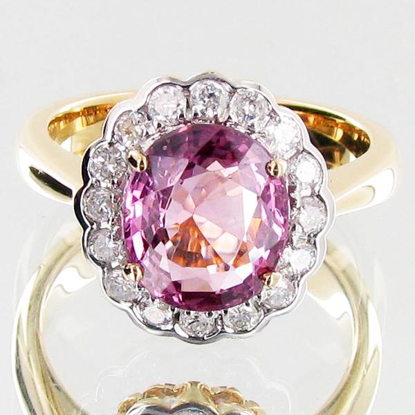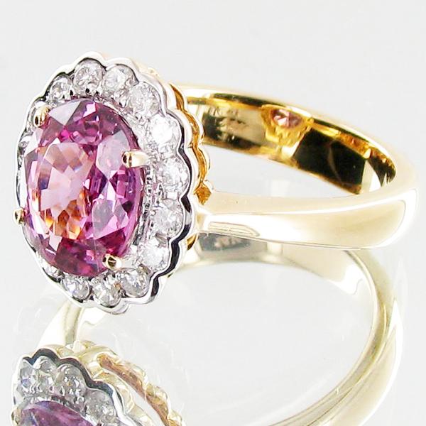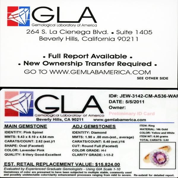 Excellent NEW well crafted 14k gold piece with main stone a lavender pink spinel; 16 I-H white accent diamonds round full cut; lab quality evaluation 8; treatment as noted; Jeweler wholesale $5000; full retail appraisal $15824; full lab evaluation available