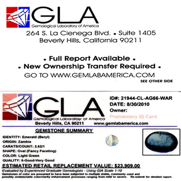 Excellent light green colored specimen oval cut; lab quality evaluation 6; treatment as noted; Gem Guide wholesale $3930-$5240; full retail appraisal $23909; full lab evaluation available