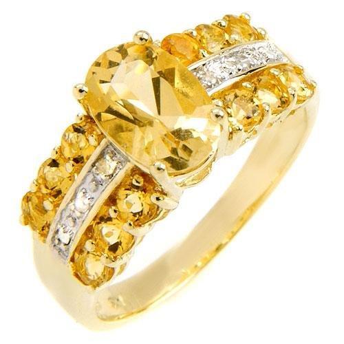 Size 9---This 10kt. yellow and white gold ring holds one oval 2.0ct. citrine, twelve round .60ctw. citrine and four round accent diamnds. The sunny yellow citrines are prong set.