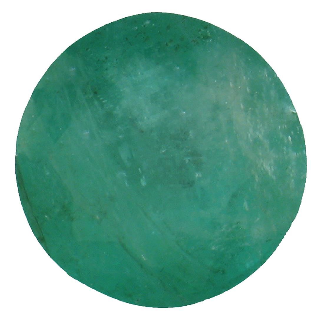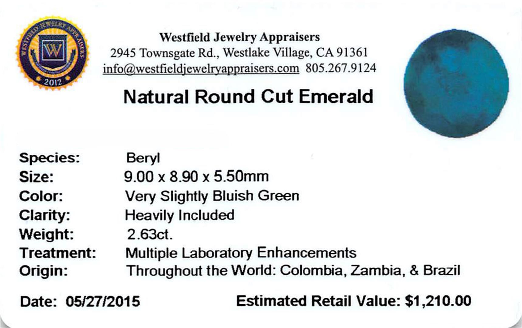 One round mixed cut natural emerald, measuring 9.00 - 8.90 x 5.50 mm, exact weight 2.63ct., clarity is heavily included, type III, medium dark, very slightly grayish, very slightly bluish green color, (GIA vslbG 6/3), cut is good. Transmitting light somewhat diffusely, translucent, Naturally occurring internal & external characteristics are present, Indications of multiple laboratory enhancements, including high temperature heat treatment. Westfield Appraised at $1,210.00.