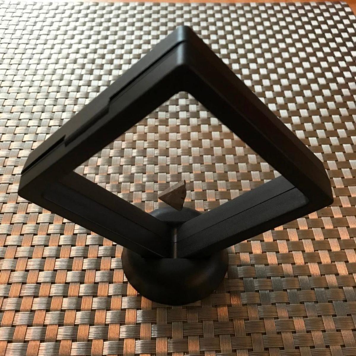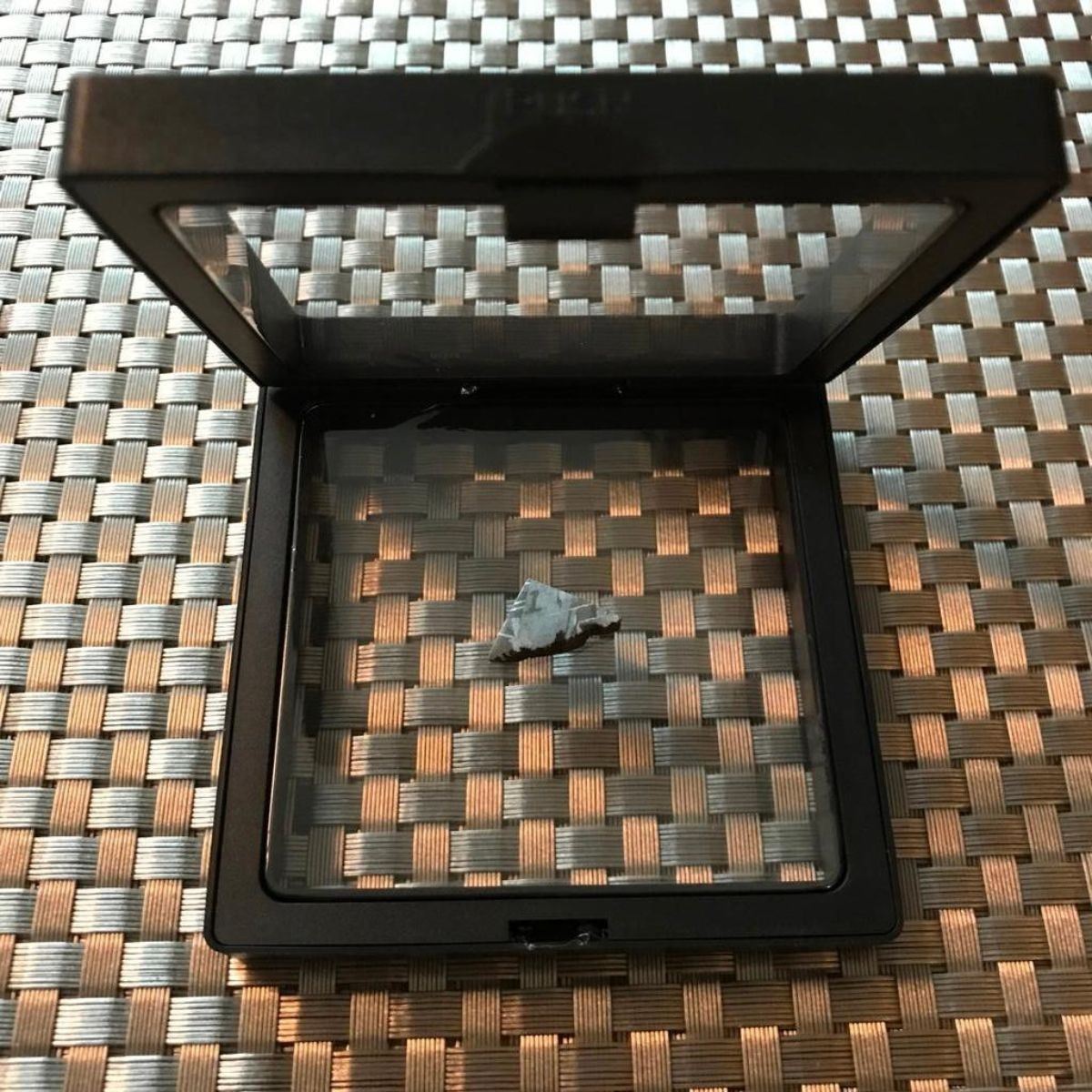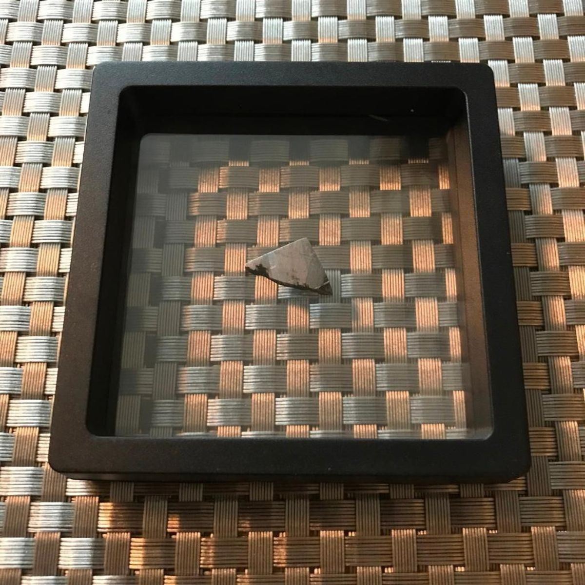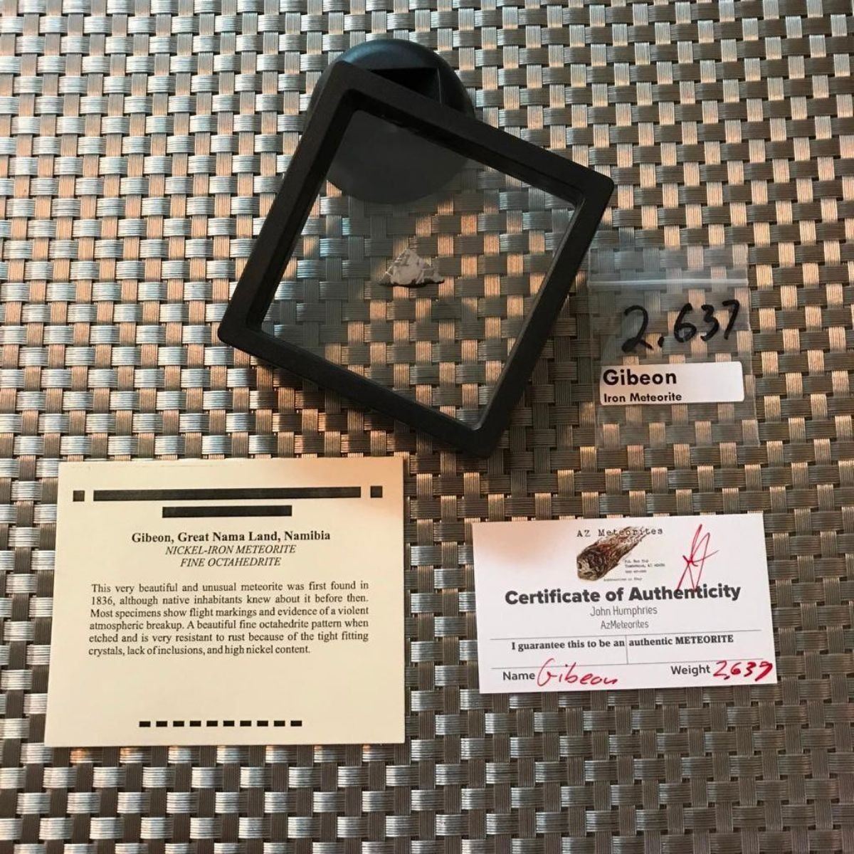 2.637 grams GIBEON iron meteorite. Fantastic triangular shaped display slice with rough border. Unusual pattern, including what appears as a number "1" on the front side. Approx 19mm L in 3 1/2" square display case. Comes with certificate of authenticity. Official meteorite name - Gibeon Year found: 1836 Country: Namibia Mass: 26 MT From the John Humphries collection, Tombstone, Arizona. Â