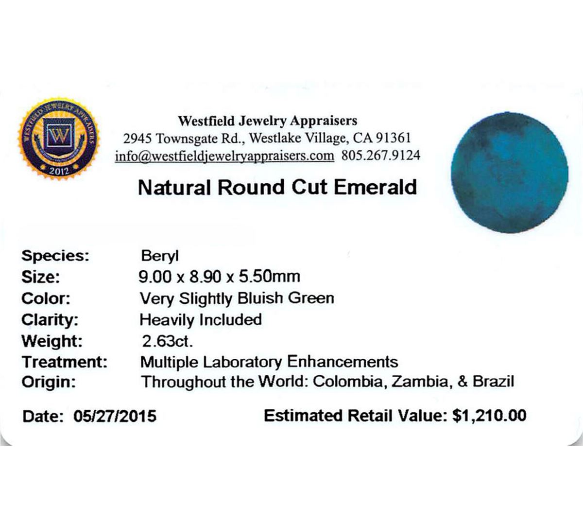 One round mixed cut natural emerald, measuring 9.00 - 8.90 x 5.50 mm, exact weight 2.63ct., clarity is heavily included, type III, medium dark, very slightly grayish, very slightly bluish green color, (GIA vslbG 6/3), cut is good. Transmitting light somewhat diffusely, translucent, Naturally occurring internal & external characteristics are present, Indications of multiple laboratory enhancements, including high temperature heat treatment. Westfield Appraised at $1,210.00.