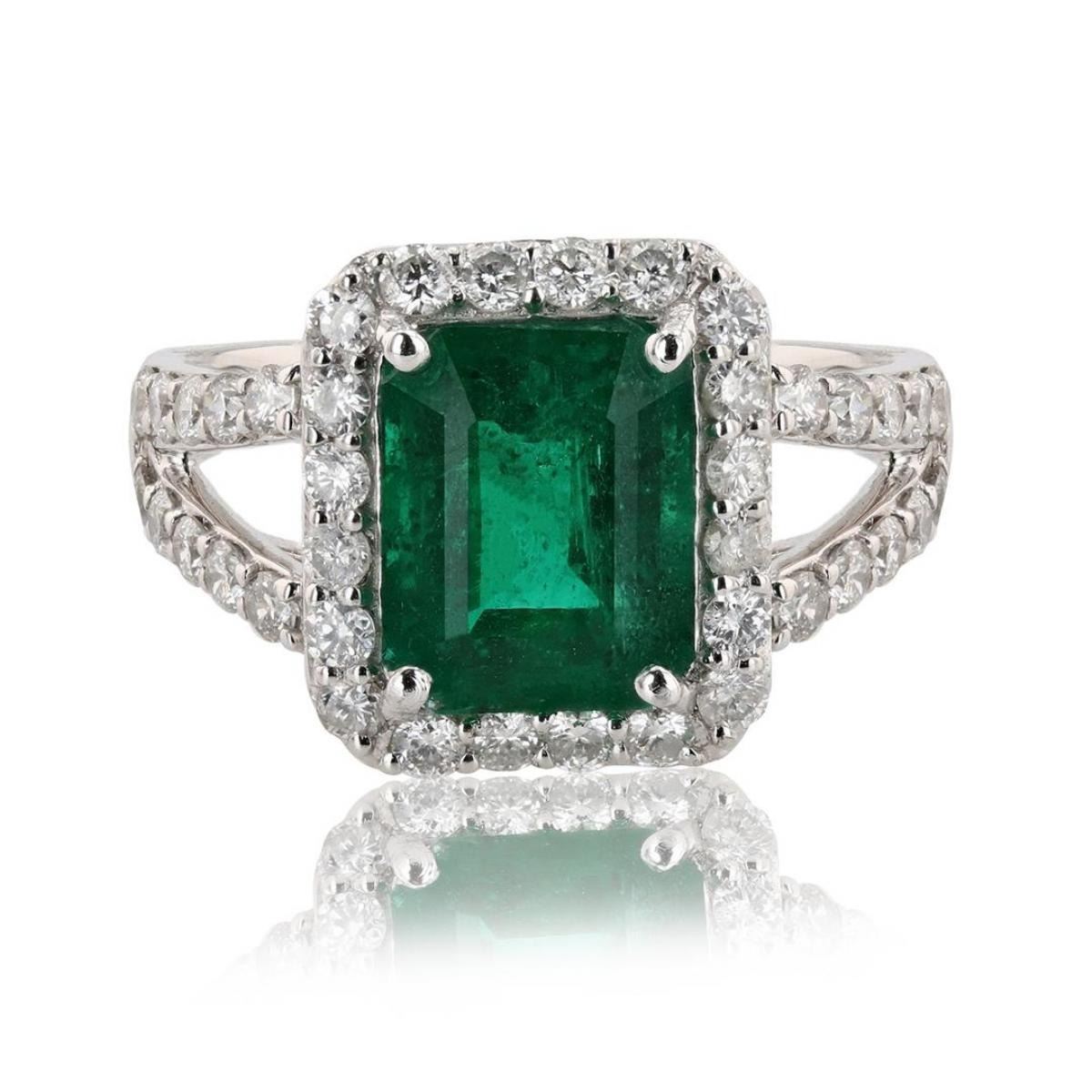 One electronically tested platinum ladies cast emerald & diamond ring. Condition is new, good workmanship. The ring features an emerald set within a diamond bezel, supported by diamond set split shoulders, completed by a two millimeter wide band. Bright polish finish. Trademark is Orianne. Identified with markings of "PT950". Containing: One prong set rectangular cut natural emerald, measuring 9.30 x 7.40 x 5.35mm, approximate weight of 2.64ct., clarity is moderately included, type III, medium dark, moderately strong, very slightly bluish green color, (GIA vslbG 6/4), cut is good. Transmitting light with a minimum of distortion, transparent. Naturally occurring internal & external characteristics are present. Graded in the setting. Forty bead set round brilliant cut diamonds, measuring 1.80 - 1.80 x 1.08mm (depth est.) approximate total weight of 40 Stones = 0.89ctw. Graded in the setting. Clarity SI-1 to I-1 Color F - H Total Weight of Colored Stones 2.64ct. Total Weight of Diamonds 0.89ctw. Total Weight of Ring 6.20 gm