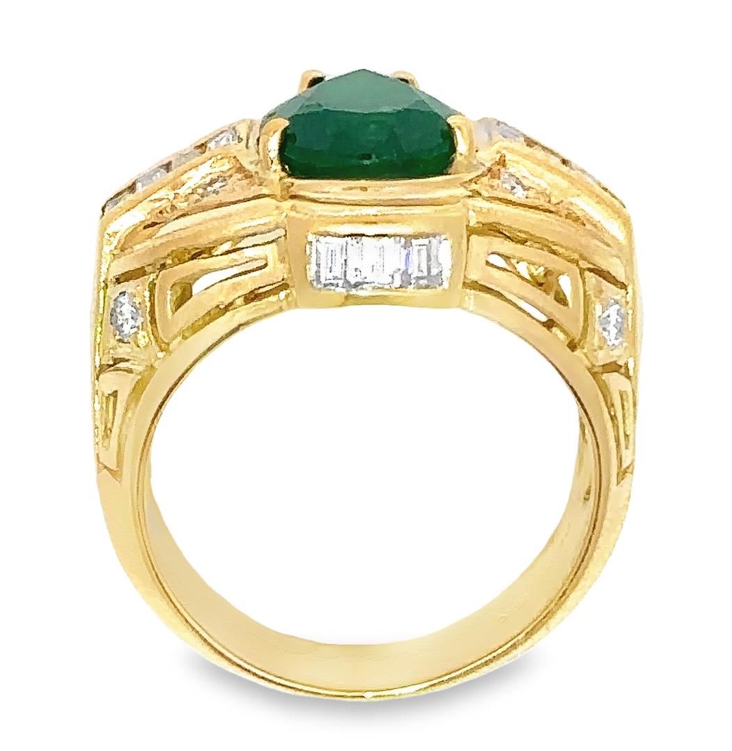 One electronically tested 18KT yellow gold lady's cast wide band fashion ring with a art deco motif with a bright polish with migraine detailing finish. The featured lady's ring has a shank measuring 5.0 millimeters. Trademark is PFPI. Identified with markings of "18K". Condition is like new, good workmanship. Containing: One prong set pear modified brilliant cut natural emerald, measuring 12.04 x 8.02 x 5.60mm, (depth est.) approximate weight of 2.64ct., clarity is moderately included, medium dark, moderately strong, green color, (GIA G 6/4), cut is very good. Transmitting light somewhat diffusely, semi-transparent to translucent. Colored gemstones are presumed to have been subjected to commonly used enhancement processes. Indications of oil residue. Graded in the setting. Twenty-Two channel set baguette cut diamonds, measuring from 2.50 x 1.50 x 1.28mm (depth est.) to 2.80 x 1.80 x 1.53mm (depth est.) approximate total weight of 22 Stones = 1.25ct. Graded in the setting. Color F - G Clarity VS-1 to VS-2 Cut Very Good Eight bead set round brilliant cut diamonds, measuring 2.00 - 1.90 x 1.21mm (depth est.) approximate total weight of 8 Stones = 0.25ct. Graded in the setting. Color G - H Clarity VS-2 to SI-1 Cut Very Good Total Weight of Colored Stones 2.64ct. Total Weight of Diamonds 1.50ct. Total Weight of Ring 11.90gm Estimated Retail Value $ 16475.00