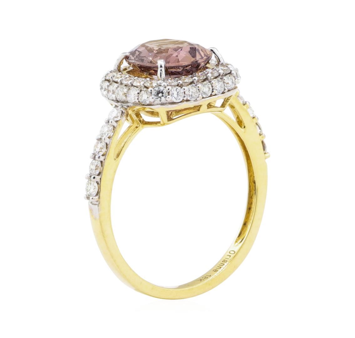 One electronically tested 18KT yellow gold ladies cast pink sapphire & diamond ring. The featured pink sapphire is set within a tiered diamond bezel, supported by an elaborate lattice under gallery and diamond set shoulders. Bright polish finish rhodium accents. Trademark is Orianne. Identified with markings of "18K". Condition is new, good workmanship. Containing: One prong set oval mixed cut natural pink sapphire, measuring 9.65 x 7.50 x 4.35mm, approximate weight of 2.64ct., clarity is eye clean, type II, medium, very slightly brownish, strongly purplish red color, (GIA stpR 5/3), cut is good. Transmitting light with no distortion, transparent. Naturally occurring internal & external characteristics are present. No evidence of laboratory high temperature treatment was detected. Graded in the setting. Thirty-Four bead set round brilliant cut diamonds, measuring 1.90 - 1.50 x 1.11mm (depth est.) approximate total weight of 34 Stones = 0.81ct. Graded in the setting. Clarity VS-2 to SI-2 Color F - H Total Weight of Colored Stones 2.64 ct. Total Weight of Diamonds 0.81 ct. Total Weight of Ring 3.75 gm Estimated Retail Value $ 11,500.00 US