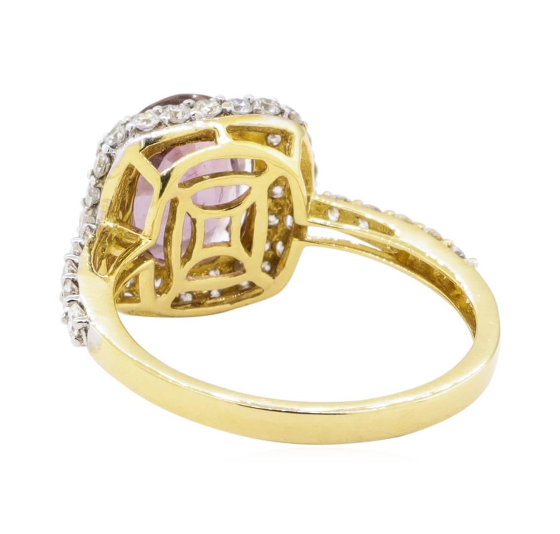 One electronically tested 18KT yellow gold ladies cast pink sapphire & diamond ring. The featured pink sapphire is set within a tiered diamond bezel, supported by an elaborate lattice under gallery and diamond set shoulders. Bright polish finish rhodium accents. Trademark is Orianne. Identified with markings of "18K". Condition is new, good workmanship. Containing: One prong set oval mixed cut natural pink sapphire, measuring 9.65 x 7.50 x 4.35mm, approximate weight of 2.64ct., clarity is eye clean, type II, medium, very slightly brownish, strongly purplish red color, (GIA stpR 5/3), cut is good. Transmitting light with no distortion, transparent. Naturally occurring internal & external characteristics are present. No evidence of laboratory high temperature treatment was detected. Graded in the setting. Thirty-Four bead set round brilliant cut diamonds, measuring 1.90 - 1.50 x 1.11mm (depth est.) approximate total weight of 34 Stones = 0.81ct. Graded in the setting. Clarity VS-2 to SI-2 Color F - H Total Weight of Colored Stones 2.64 ct. Total Weight of Diamonds 0.81 ct. Total Weight of Ring 3.75 gm Estimated Retail Value $ 11,500.00 US
