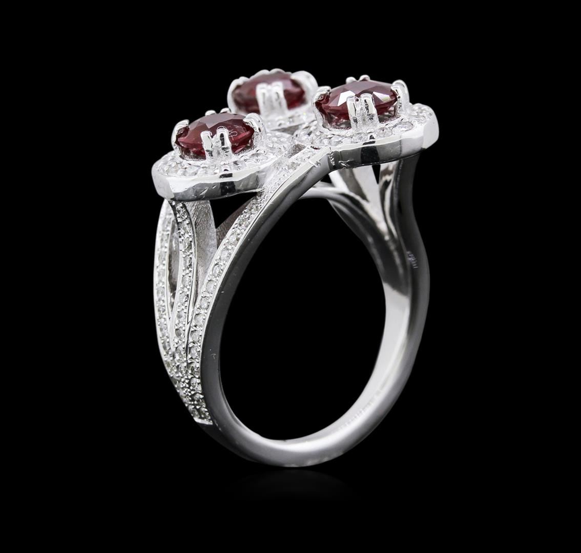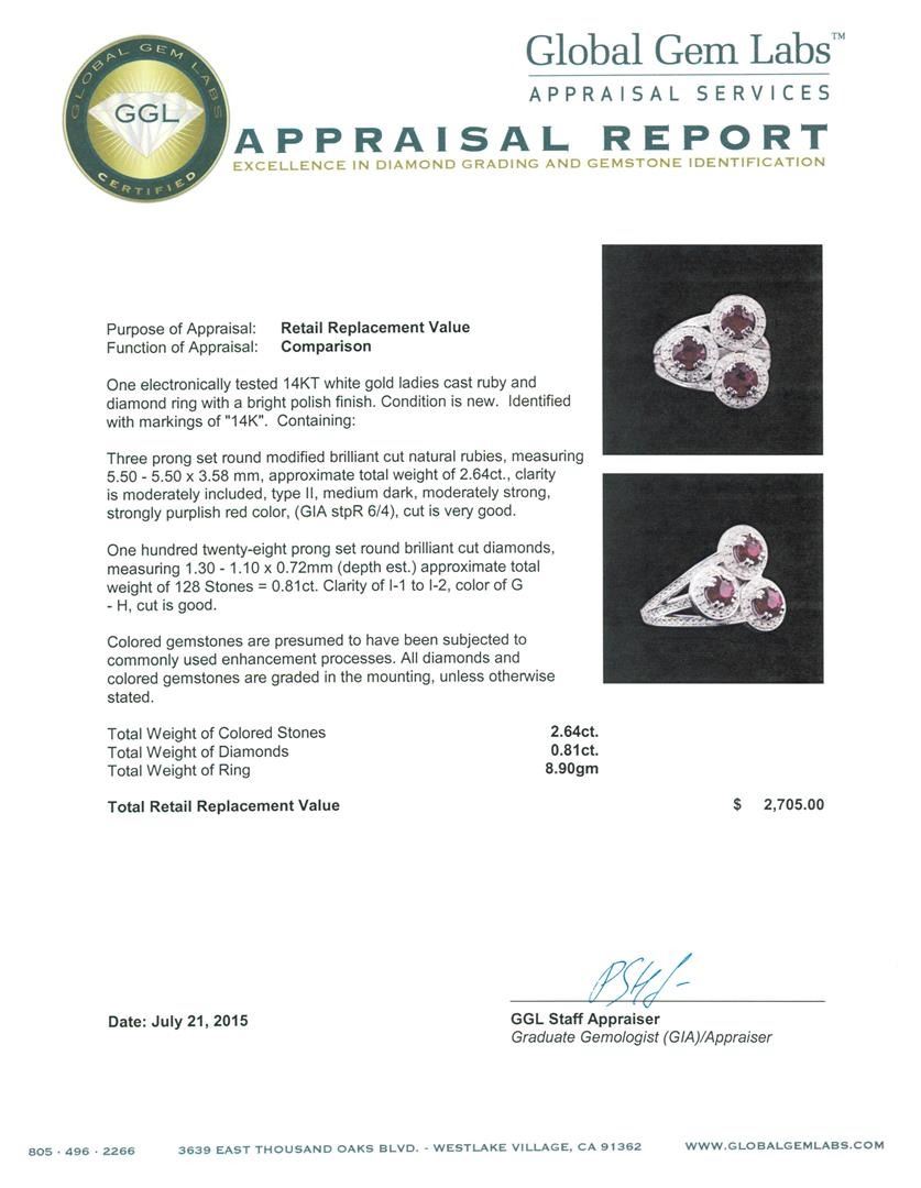 One electronically tested 14KT white gold ladies cast ruby and diamond ring with a bright polish finish. Identified with markings of "14K". Condition is new. Containing: Three prong set round modified brilliant cut natural rubies, measuring 5.50 - 5.50 x 3.58 mm, approximate total weight of 2.64ct., clarity is moderately included, type II, medium dark, moderately strong, strongly purplish red color, (GIA stpR 6/4), cut is very good. One Hundred Twenty-Eight prong set round brilliant cut diamonds, measuring 1.30 - 1.10 x 0.72mm (depth est.) approximate total weight of 128 Stones = 0.81ct. Clarity: I-1 to I-2. Color: G - H, Cut is Good. Colored gemstones are presumed to have been subjected to commonly used enhancement processes. All diamonds and colored gemstones are graded in the mounting, unless otherwise stated. Total Weight of Colored Stones 2.64ct. Total Weight of Diamonds 0.81ct. Total Weight of Ring 8.90gm. GGL Appraised.
