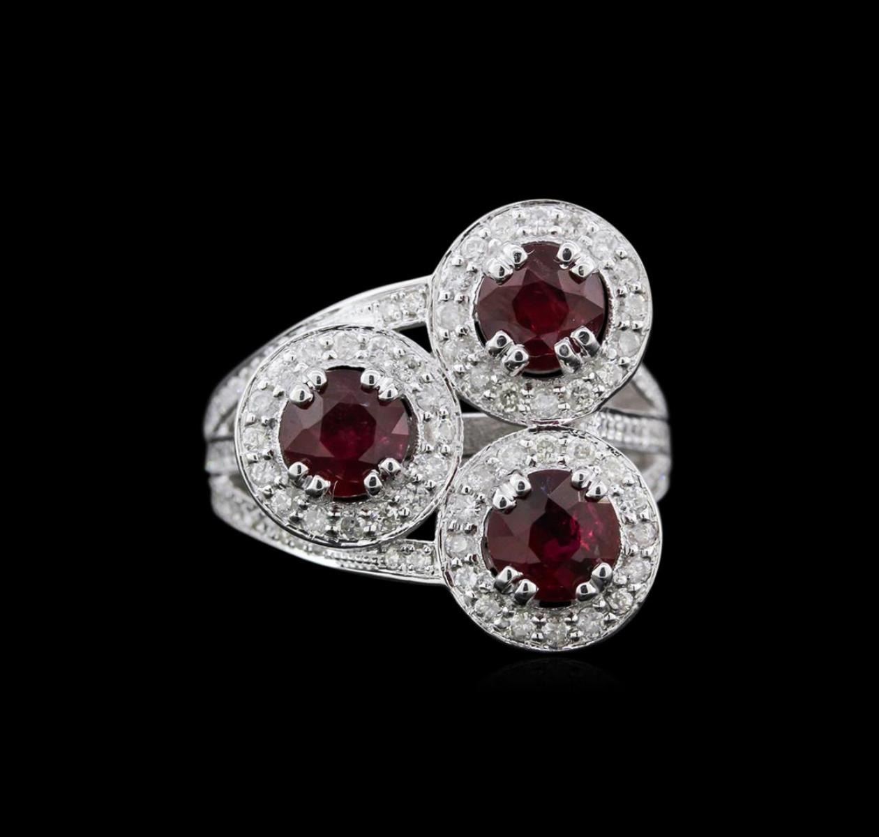 One electronically tested 14KT white gold ladies cast ruby and diamond ring with a bright polish finish. Identified with markings of "14K". Condition is new. Containing: Three prong set round modified brilliant cut natural rubies, measuring 5.50 - 5.50 x
