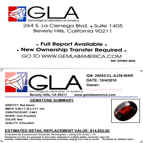 Excellent red colored specimen oval cut; lab quality evaluation 9; treatment as noted; Gem Guide wholesale $1980-$3300; full retail appraisal $14652; full lab evaluation available
