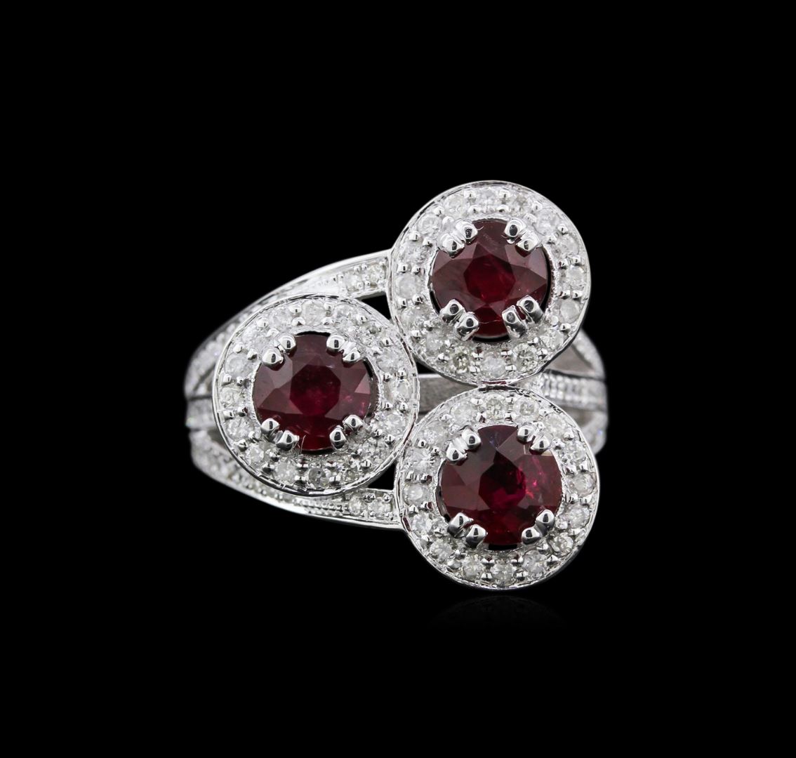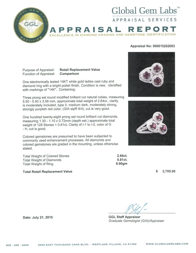 One electronically tested 14KT white gold ladies cast ruby and diamond ring with a bright polish finish. Identified with markings of "14K". Condition is new. Containing: Three prong set round modified brilliant cut natural rubies, measuring 5.50 - 5.50 x 3.58 mm, approximate total weight of 2.64ct., clarity is moderately included, type II, medium dark, moderately strong, strongly purplish red color, (GIA stpR 6/4), cut is very good. One Hundred Twenty-Eight prong set round brilliant cut diamonds, measuring 1.30 - 1.10 x 0.72mm (depth est.) approximate total weight of 128 Stones = 0.81ct. Clarity: I-1 to I-2. Color: G - H, Cut is Good. Colored gemstones are presumed to have been subjected to commonly used enhancement processes. All diamonds and colored gemstones are graded in the mounting, unless otherwise stated. Total Weight of Colored Stones 2.64ct. Total Weight of Diamonds 0.81ct. Total Weight of Ring 8.90gm. GGL Appraised at $2,705.00.