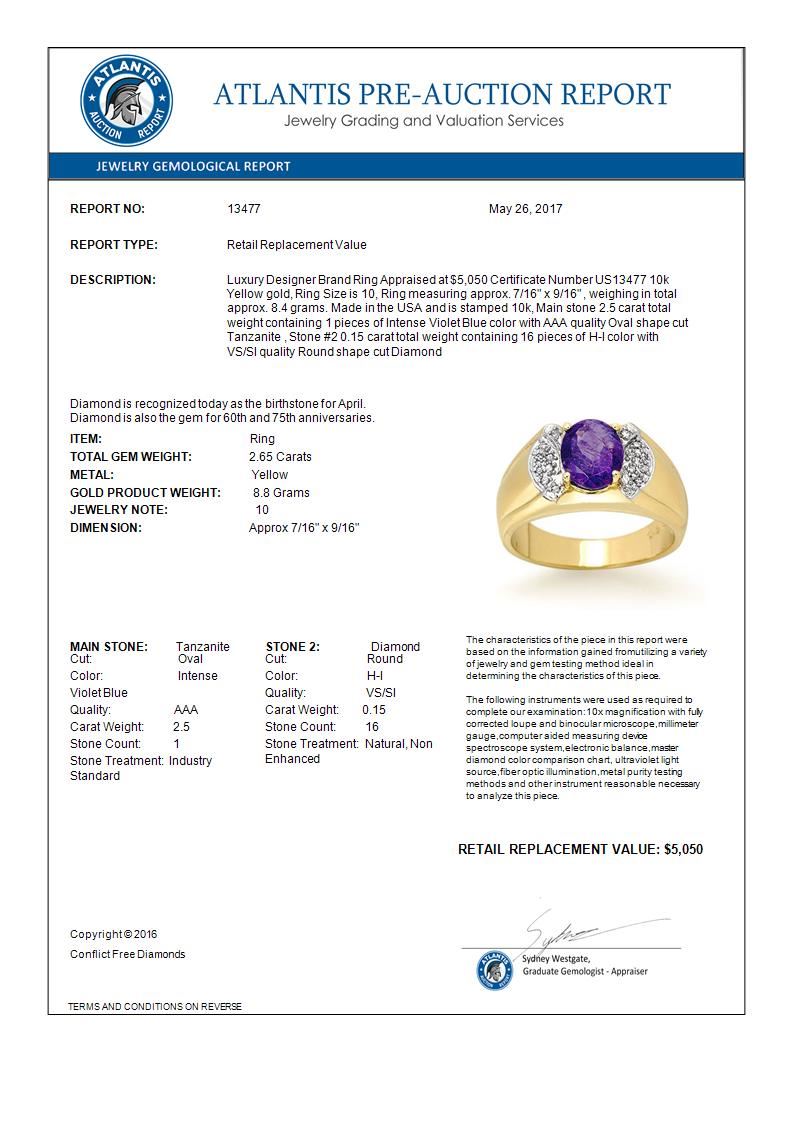 2.65 CTW Tanzanite & Diamond Mens Ring 10K Yellow Gold ---- Luxury Designer Brand Ring Appraised Retail Price at $5,050 ---- SKU Number US13477 10k Yellow gold Ring Size is 10, Ring measuring approx. 7/16" x 9/16" , weighing in total approx. 8.4 grams. Made in the USA and is stamped 10k, Main stone 2.5 carat total weight containing 1 pieces of Intense Violet Blue color with AAA quality Oval shape cut Tanzanite , Stone #2 0.15 carat total weight containing 16 pieces of H-I color with VS/SI quality Round shape cut