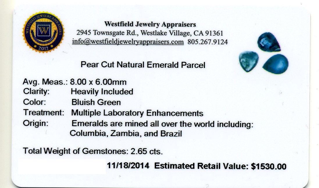 2.65cts. Pear Cut Natural Emerald Parcel Westfield Appraised at $1,530.00.