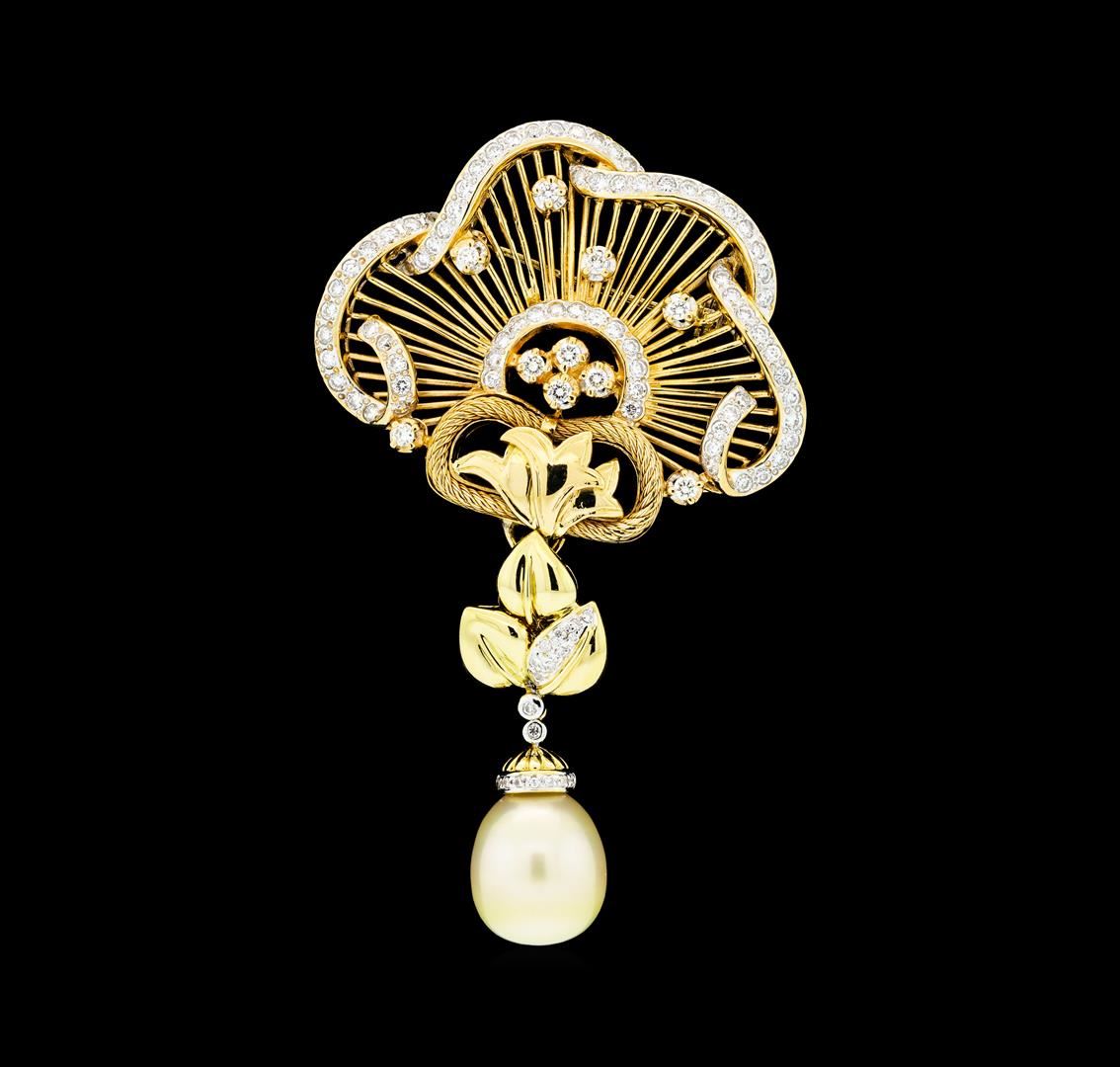 One electronically tested 18KT yellow gold lady's combination cast & assembled fashion pendant-pin with a bright polish, hand-engraved detail finish. The featured lady's pendant-pin has detachable section that can be worn as a pendant. Identified with markings of '18K'. Condition is like new, good workmanship. Containing: One chinese freshwater pearl, 16.0mm to 13.5mm in size. The pearl is off white in color with a good luster, tear drop, and mostly clean. Graded in the setting. Ten prong set round brilliant cut diamonds, measuring 2.30 - 2.20 x 1.40mm (depth est.) approximate total weight of 10 Stones = 0.43ct. Graded in the setting. Color H - I Clarity SI-1 to SI-2 Cut Good Seventy-Five prong set round brilliant cut diamonds, measuring 2.00 - 1.90 x 1.21mm (depth est.) approximate total weight of 75 Stones = 2.10ct. Graded in the setting. Color H - I Clarity VS-2 to SI-1 Cut Good Eighteen prong set round brilliant cut diamonds, measuring 1.40 - 1.00 x 0.74mm (depth est.) approximate total weight of 18 Stones = 0.12ct. Graded in the setting. Color H - I Clarity SI-1 to SI-2 Cut Good. Total Weight of Diamonds 2.65ct.. Total Weight of Pendant-Pin 36.10gm. GAS Appraised at $10,205.00.