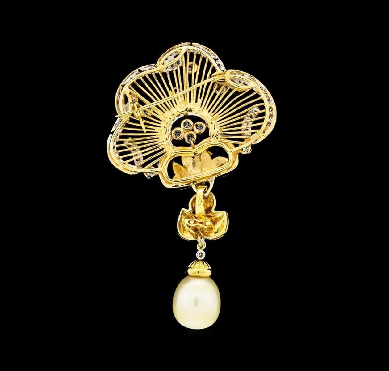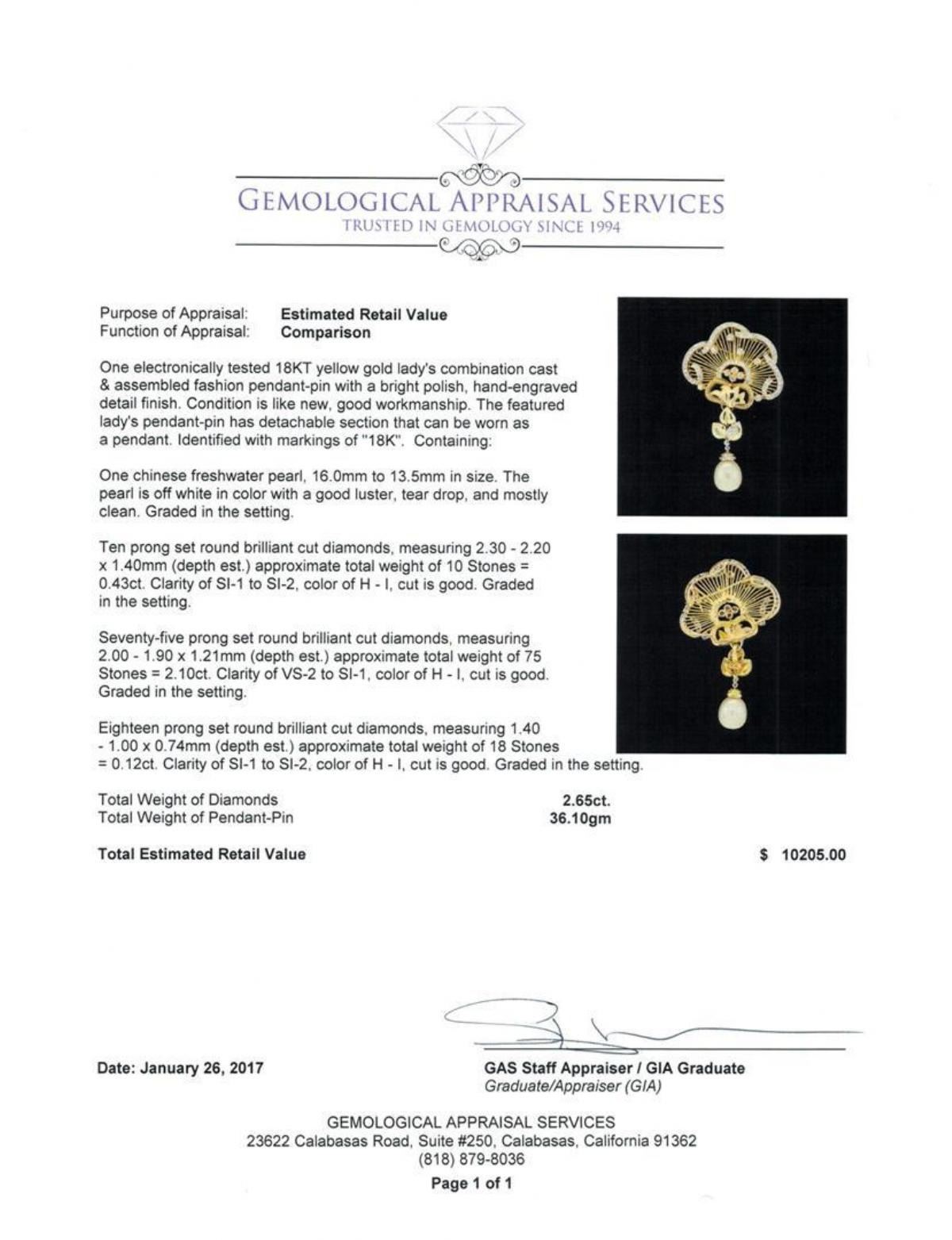 One electronically tested 18KT yellow gold lady's combination cast & assembled fashion pendant-pin with a bright polish, hand-engraved detail finish. The featured lady's pendant-pin has detachable section that can be worn as a pendant. Identified with markings of '18K'. Condition is like new, good workmanship. Containing: One chinese freshwater pearl, 16.0mm to 13.5mm in size. The pearl is off white in color with a good luster, tear drop, and mostly clean. Graded in the setting. Ten prong set round brilliant cut diamonds, measuring 2.30 - 2.20 x 1.40mm (depth est.) approximate total weight of 10 Stones = 0.43ct. Graded in the setting. Color H - I Clarity SI-1 to SI-2 Cut Good Seventy-Five prong set round brilliant cut diamonds, measuring 2.00 - 1.90 x 1.21mm (depth est.) approximate total weight of 75 Stones = 2.10ct. Graded in the setting. Color H - I Clarity VS-2 to SI-1 Cut Good Eighteen prong set round brilliant cut diamonds, measuring 1.40 - 1.00 x 0.74mm (depth est.) approximate total weight of 18 Stones = 0.12ct. Graded in the setting. Color H - I Clarity SI-1 to SI-2 Cut Good. Total Weight of Diamonds 2.65ct.. Total Weight of Pendant-Pin 36.10gm. GAS Appraised.