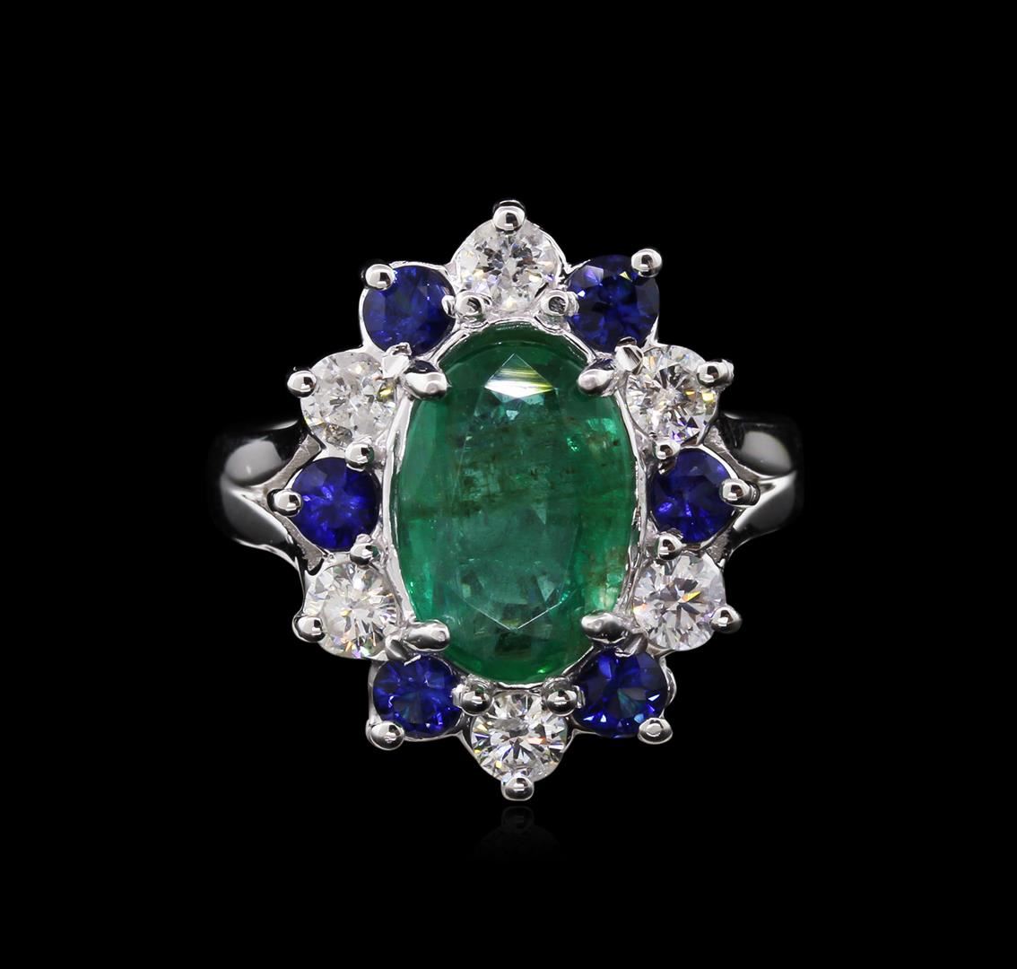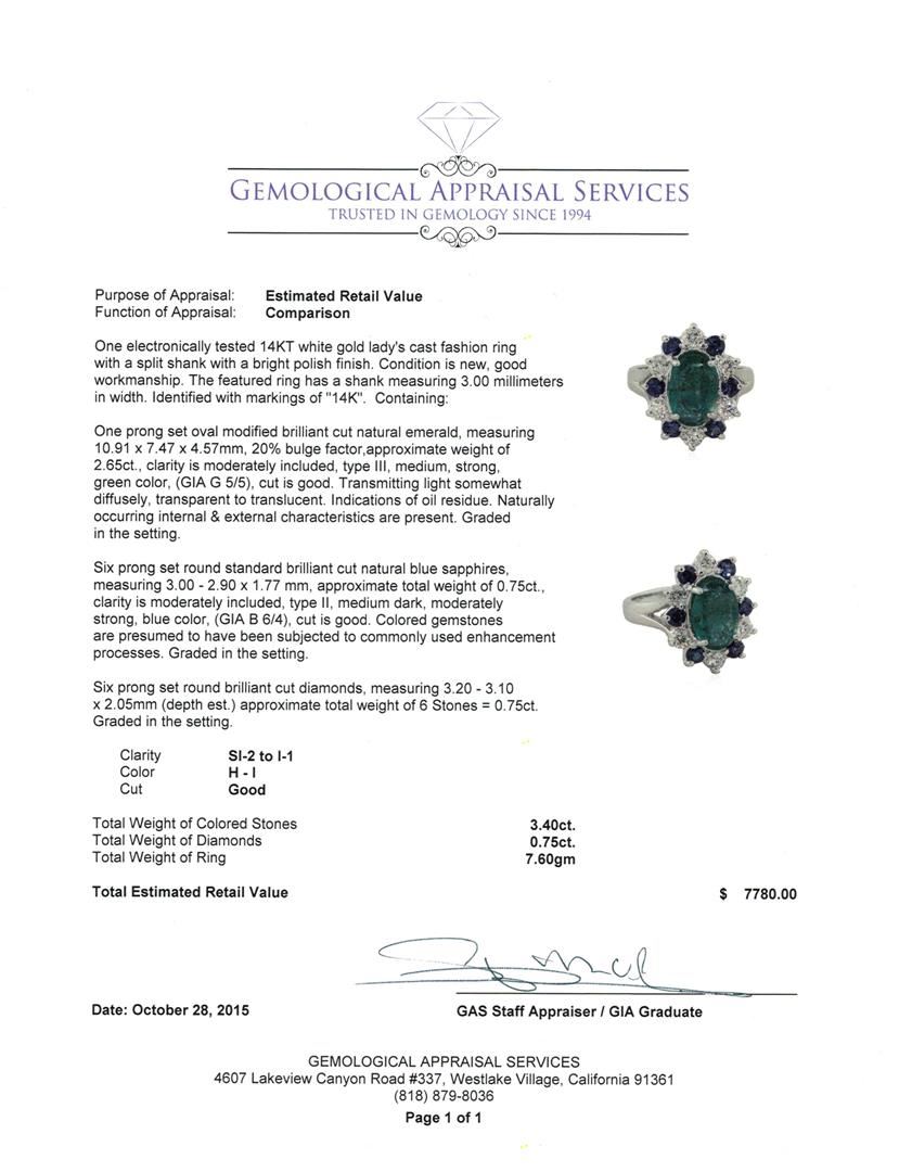 One electronically tested 14KT white gold lady's cast fashion ring with a split shank with a bright polish finish. The featured ring has a shank measuring 3.00 millimeters in width. Identified with markings of "14K". Condition is new, good workmanship. Containing: One prong set oval modified brilliant cut natural emerald, measuring 10.91 x 7.47 x 4.57mm, 20% bulge factor, approximate weight of 2.65ct., clarity is moderately included, type III, medium, strong, green color, (GIA G 5/5), cut is good. Transmitting light somewhat diffusely, transparent to translucent. Indications of oil residue. Naturally occurring internal & external characteristics are present. Graded in the setting. Six prong set round standard brilliant cut natural blue sapphires, measuring 3.00 - 2.90 x 1.77 mm, approximate total weight of 0.75ct., clarity is moderately included, type II, medium dark, moderately strong, blue color, (GIA B 6/4), cut is good. Colored gemstones are presumed to have been subjected to commonly used enhancement processes. Graded in the setting. Six prong set round brilliant cut diamonds, measuring 3.20 - 3.10 x 2.05mm (depth est.) approximate total weight of 6 Stones = 0.75ct. Graded in the setting. Clarity: SI-2 to I-1. Color: H - I. Cut Good. Total Weight of Colored Stones 3.40ct. Total Weight of Diamonds 0.75ct. Total Weight of Ring 7.60gm. GAS Appraised at $7,780.00.