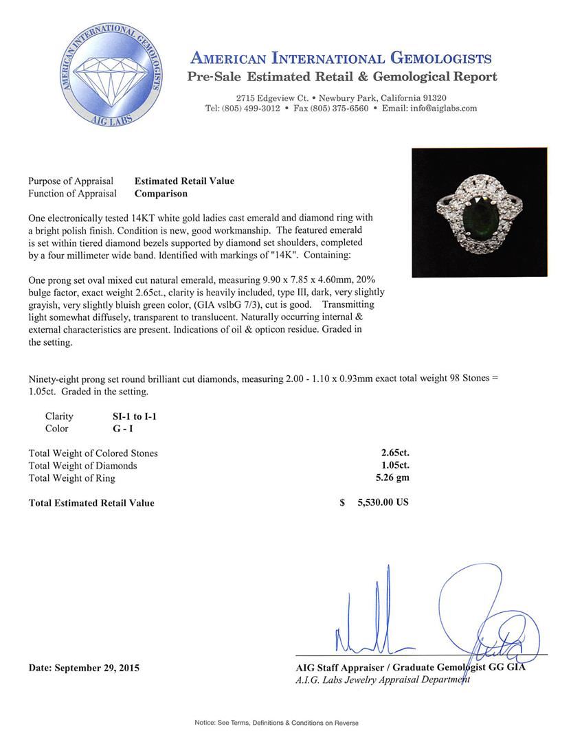 One electronically tested 14KT white gold ladies cast emerald and diamond ring with a bright polish finish. The featured emerald is set within tiered diamond bezels supported by diamond set shoulders, completed by a four millimeter wide band. Identified with markings of "14K". Condition is new, good workmanship. Containing: One prong set oval mixed cut natural emerald, measuring 9.90 x 7.85 x 4.60mm, 20% bulge factor, exact weight 2.65ct., clarity is heavily included, type III, dark, very slightly grayish, very slightly bluish green color, (GIA vslbG 7/3), cut is good. Transmitting light somewhat diffusely, transparent to translucent. Naturally occurring internal & external characteristics are present. Indications of oil & opticon residue. Graded in the setting. Ninety-Eight prong set round brilliant cut diamonds, measuring 2.00 - 1.10 x 0.93mm exact total weight 98 Stones = 1.05ct. Graded in the setting. Clarity: SI-1 to I-1. Color: G - I. Total Weight of Colored Stones 2.65ct. Total Weight of Diamonds 1.05ct. Total Weight of Ring 5.26gm. AIG Appraised at $5,530.00.