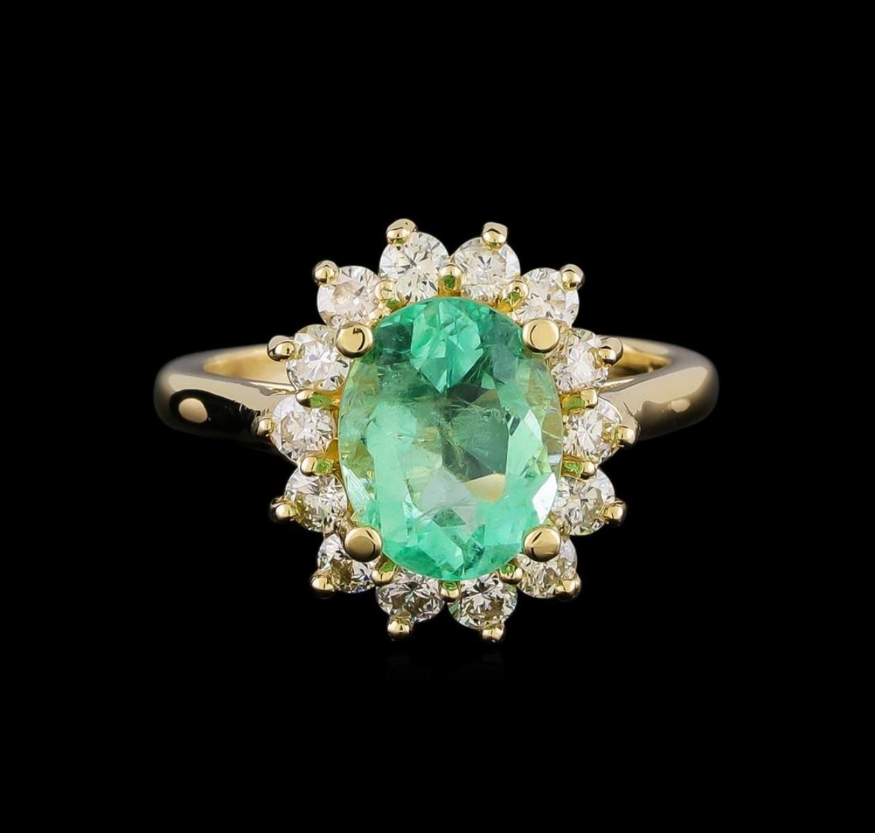 One electronically tested 14KT yellow gold lady's cast fashion ring with a cathedral basket halo with a bright polish finish. The featured lady's has a shank measuring 2.14 millimeters in width. Identified with markings of "14K". Condition is new, good workmanship. Containing: One prong set oval modified brilliant cut natural emerald, measuring 10.27 x 8.09 x 5.45mm, (depth est.) approximate weight of 2.65ct., clarity is moderately included, medium light, moderately strong, green color, (GIA G 4/4), cut is good. Transmitting light with a minimum of distortion, transparent. Indications of oil residue. Naturally occurring internal & external characteristics are present. Colored gemstones are presumed to have been subjected to commonly used enhancement processes. Graded in the setting. Fourteen prong set round brilliant cut diamonds, measuring 2.55 - 2.50 x 1.56mm (depth est.) approximate total weight of 14 Stones = 0.88ct. Graded in the setting. Clarity: SI-1 to SI-2. Color: H - Good. Total Weight of Colored Stones 2.65ct. Total Weight of Diamonds 0.88ct. Total Weight of Ring 5.40gm. GAS Appraised.