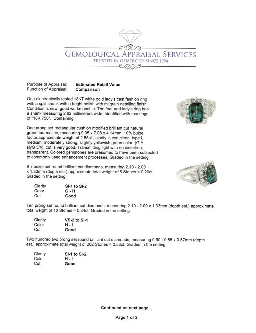One electronically tested 18KT white gold lady's cast fashion ring with a split shank with a bright polish with milgrain detailing finish. The featured lady's ring has a shank measuring 2.62 millimeters wide. Identified with markings of "18K 750". Condition is new, good workmanship. Containing: One prong set rectangular cushion modified brilliant cut natural green tourmaline, measuring 9.95 x 7.08 x 4.14mm, 10% bulge factor, approximate weight of 2.65ct., clarity is eye clean, type I, medium, moderately strong, slightly yellowish green color, (GIA slyG 5/4), cut is very good. Transmitting light with no distortion, transparent. Colored gemstones are presumed to have been subjected to commonly used enhancement processes. Graded in the setting. Six bezel set round brilliant cut diamonds, measuring 2.10 - 2.00 x 1.33mm (depth est.) approximate total weight of 6 Stones = 0.20ct. Graded in the setting. Clarity: SI-1 to SI-2. Color: G - Good Ten prong set round brilliant cut diamonds, measuring 2.10 - 2.00 x 1.33mm (depth est.) approximate total weight of 10 Stones = 0.34ct. Graded in the setting. Clarity: VS-2 to SI-1. Color: H - I. Cut Good Two Hundred Two prong set round brilliant cut diamonds, measuring 0.90 - 0.85 x 0.57mm (depth est.) approximate total weight of 202 Stones = 0.53ct. Graded in the setting. Clarity: SI-1 to SI-2. Color: H - I. Cut Good. Total Weight of Colored Stones 2.65ct. Total Weight of Diamonds 1.07ct. Total Weight of Ring 8.00gm. GAS Appraised at $7,185.00.