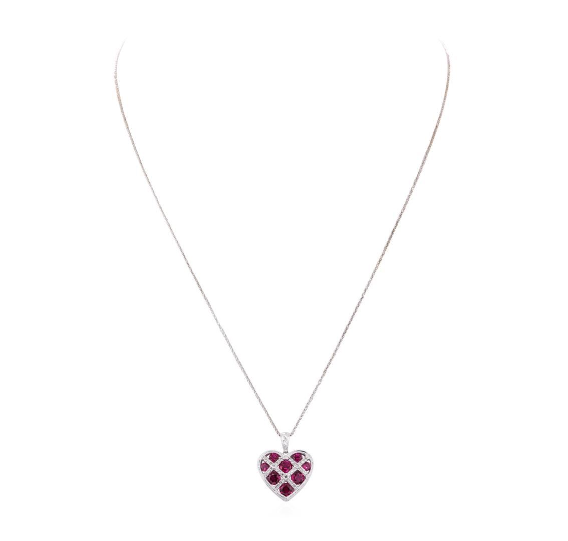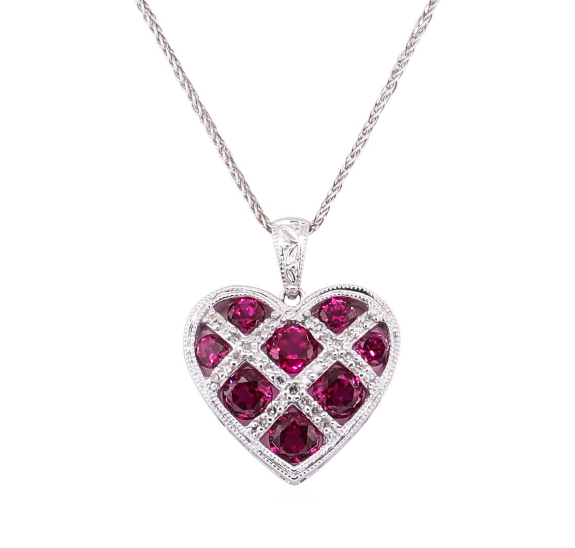 One heart shaped pendant with chain featuring: 10KT and 14KT white gold weighing 4.2 grams containing lab grown rubies weighing 2.50ctw and diamonds weighing 0.15ctw. The pendant is cast from 10KT white gold and has an attached eighteen inch long 1mm wheat link chain that is cast from 14KT white gold.