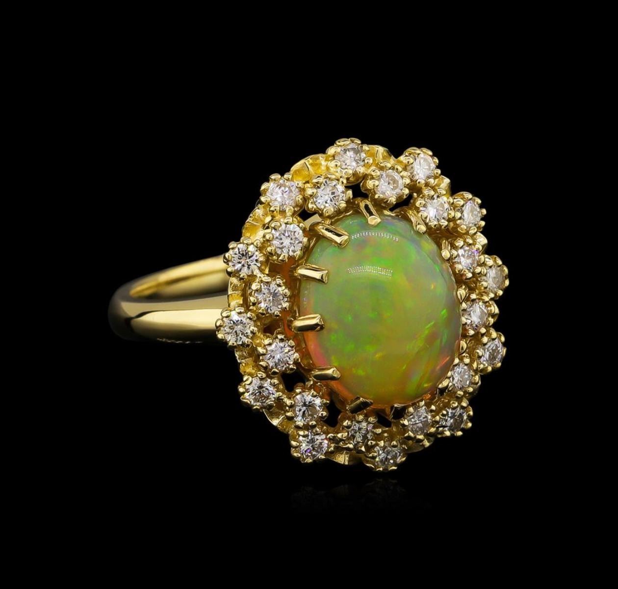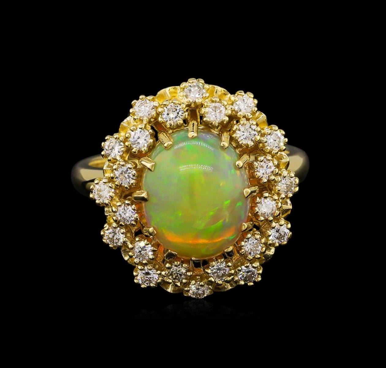 One ring featuring: 14KT yellow gold weighing 6.73 grams containing one opal with a total weight of 2.65ct and side diamonds with a total weight of 0.58ct.