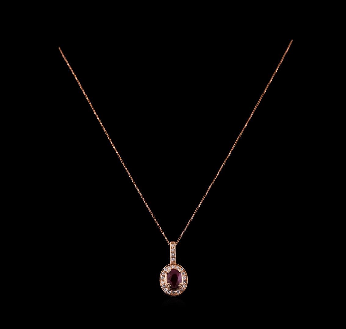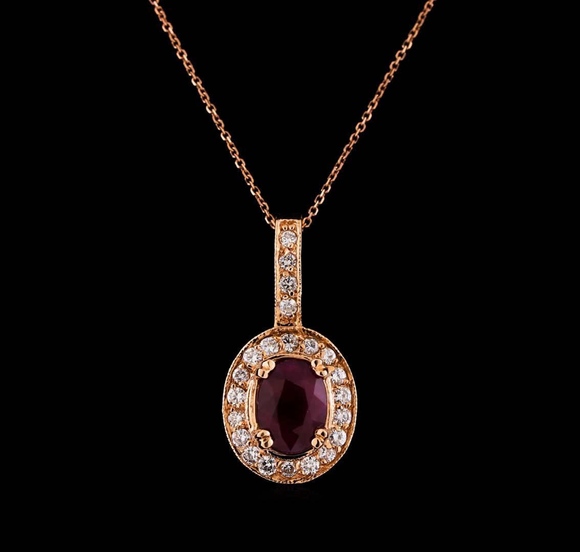 One pendant with chain: 14KT rose gold weighing 5.0gm containing a ruby center stone with a total weight of 2.65ct and diamonds weighing 0.53ctw.