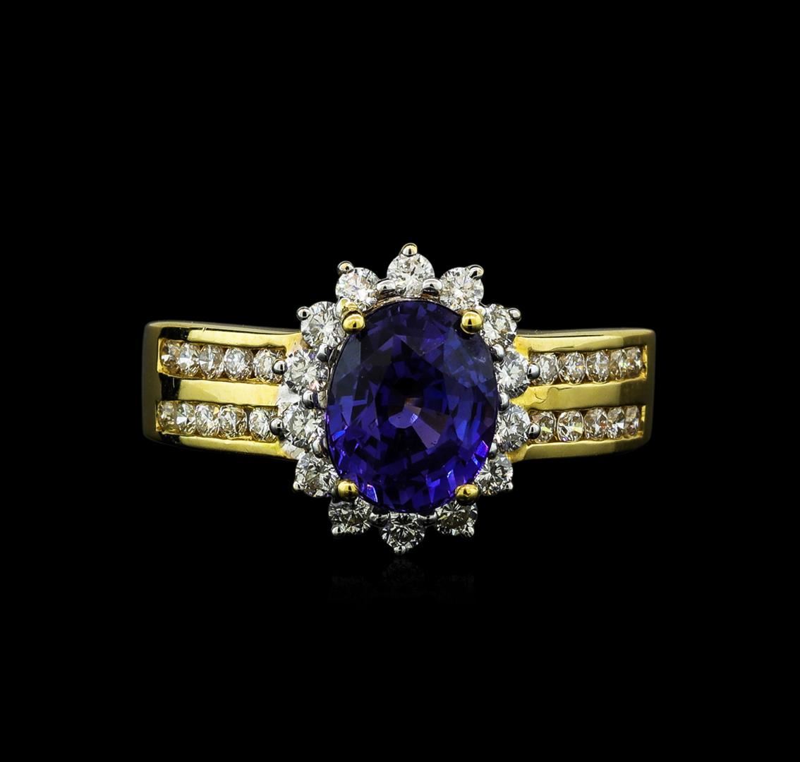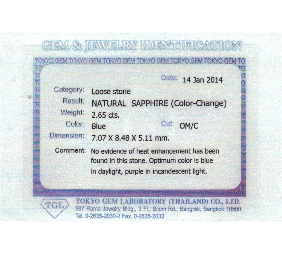 One electronically tested 18KT yellow gold lady's cast fashion ring with a basket halo with a bright polish finish. The featured lady's ring has a shank measuring 2.95 millimeters wide. Identified with markings of '18K'. Condition is new, good workmanship. Containing: One prong set oval modified brilliant cut natural color change sapphire, measuring 7.07 x 8.48 x 5.11mm, (depth est.) 3%. bulge factor, approximate weight of 2.65ct., clarity is eye clean, medium dark, strong, blue color, (GIA B 6/5) to medium dark, strong, bluish purple, (GIA bP 6/5), cut is very good. Transmitting light with no distortion, transparent. No indications of heat treatment. Graded loose prior to setting in the TGL Laboratory, Report #24010424. Fourteen prong set round brilliant cut diamonds, measuring 2.00 - 1.90 x 1.21mm (depth est.) approximate total weight of 14 Stones = 0.40ct. Graded in the setting. Clarity VS-2 to SI-1. Color: F - G Cut Very Good Twenty channel set round brilliant cut diamonds, measuring 1.60 - 1.50 x 0.96mm (depth est.) approximate total weight of 20 Stones = 0.28ct. Graded in the setting. Clarity VS-2 to SI-1. Color: G - H Cut Very Good. Total Weight of Colored Stones 2.65ct.. Total Weight of Diamonds 0.68ct.. Total Weight of Ring 4.90gm GAS Appraised at $17,220.00.