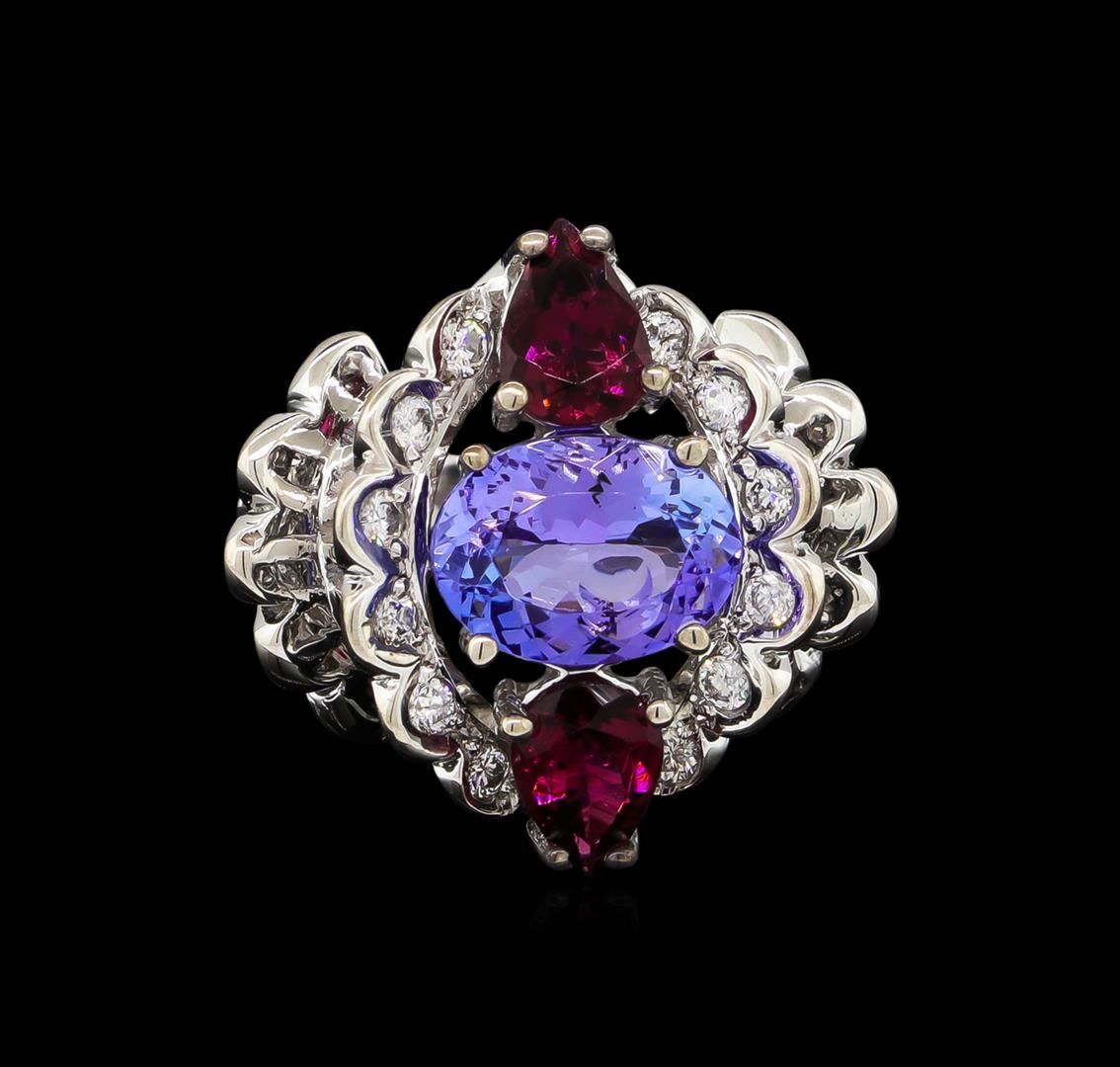 One electronically tested 14KT white gold lady's cast fashion ring with a bright polish finish. The featured lady's ring has trumpet floral motif and a shank measuring 2.64 millimeters wide. Identified with markings of "K14". Condition is new, good workmanship. Containing: One prong set oval modified brilliant cut natural tanzanite, measuring 10.10 x 7.84 x 4.92mm, approximate weight of 2.65ct., clarity is eye clean, type I, medium light, moderately strong, bluish violet color, (GIA bV 4/4), cut is good. Transmitting light with no distortion, transparent. Colored gemstones are presumed to have been subjected to commonly used enhancement processes. Graded in the setting. Two prong set pear modified brilliant cut natural pink tourmalines, measuring 7.10 x 4.96 x 2.85mm, approximate total weight of 1.22ct., clarity is eye clean, type II, medium, moderately strong, strongly purplish red color, (GIA stpR 5/4), cut is good. Transmitting light with no distortion, transparent. Colored gemstones are presumed to have been subjected to commonly used enhancement processes. Graded in the setting. Twelve prong set round brilliant cut diamonds, measuring 1.90 - 1.80 x 1.15mm (depth est.) approximate total weight of 12 Stones = 0.30ct. Graded in the setting. Clarity: SI-1 to SI-2. Color: H - I. Cut Good. Total Weight of Colored Stones 3.87ct. Total Weight of Diamonds 0.30ct. Total Weight of Ring 9.40gm. GAS Appraised at $6,210.00.