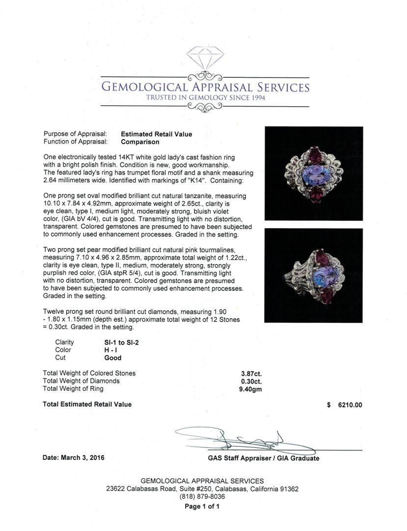 One electronically tested 14KT white gold lady's cast fashion ring with a bright polish finish. The featured lady's ring has trumpet floral motif and a shank measuring 2.64 millimeters wide. Identified with markings of "K14". Condition is new, good workmanship. Containing: One prong set oval modified brilliant cut natural tanzanite, measuring 10.10 x 7.84 x 4.92mm, approximate weight of 2.65ct., clarity is eye clean, type I, medium light, moderately strong, bluish violet color, (GIA bV 4/4), cut is good. Transmitting light with no distortion, transparent. Colored gemstones are presumed to have been subjected to commonly used enhancement processes. Graded in the setting. Two prong set pear modified brilliant cut natural pink tourmalines, measuring 7.10 x 4.96 x 2.85mm, approximate total weight of 1.22ct., clarity is eye clean, type II, medium, moderately strong, strongly purplish red color, (GIA stpR 5/4), cut is good. Transmitting light with no distortion, transparent. Colored gemstones are presumed to have been subjected to commonly used enhancement processes. Graded in the setting. Twelve prong set round brilliant cut diamonds, measuring 1.90 - 1.80 x 1.15mm (depth est.) approximate total weight of 12 Stones = 0.30ct. Graded in the setting. Clarity: SI-1 to SI-2. Color: H - I. Cut Good. Total Weight of Colored Stones 3.87ct. Total Weight of Diamonds 0.30ct. Total Weight of Ring 9.40gm. GAS Appraised at $6,210.00.